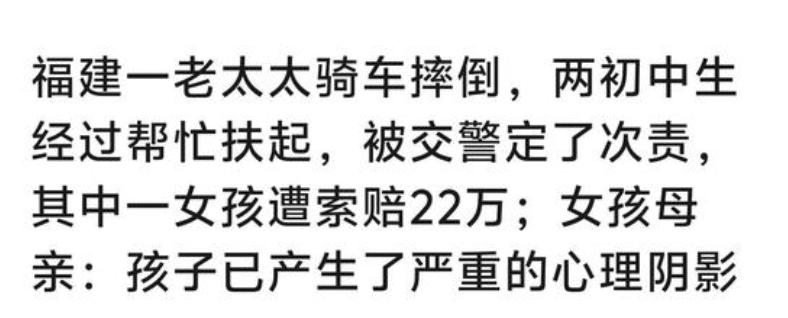 这就很离谱。 福建一老太骑车在拐弯处摔倒,两名年轻女孩骑电动车经过,见其摔倒好心搀扶,却被判了次责,其中一名女孩被判22万,家长称孩子心理已经受伤了,蒙上了阴影。 网友也是众说纷纭,一瞬间让人又回到了当年江苏南京法官事件,非汝撞,何扶耶