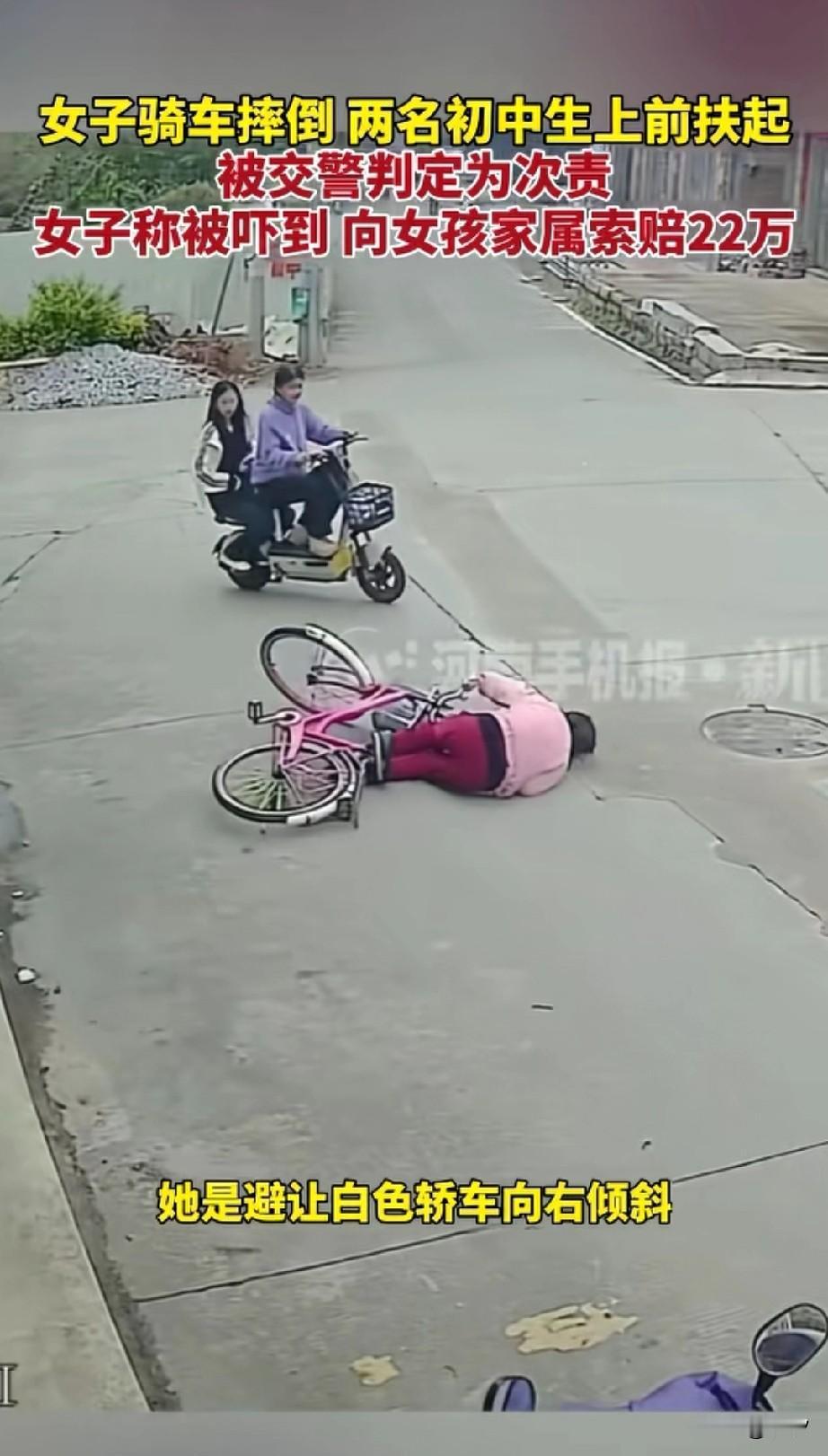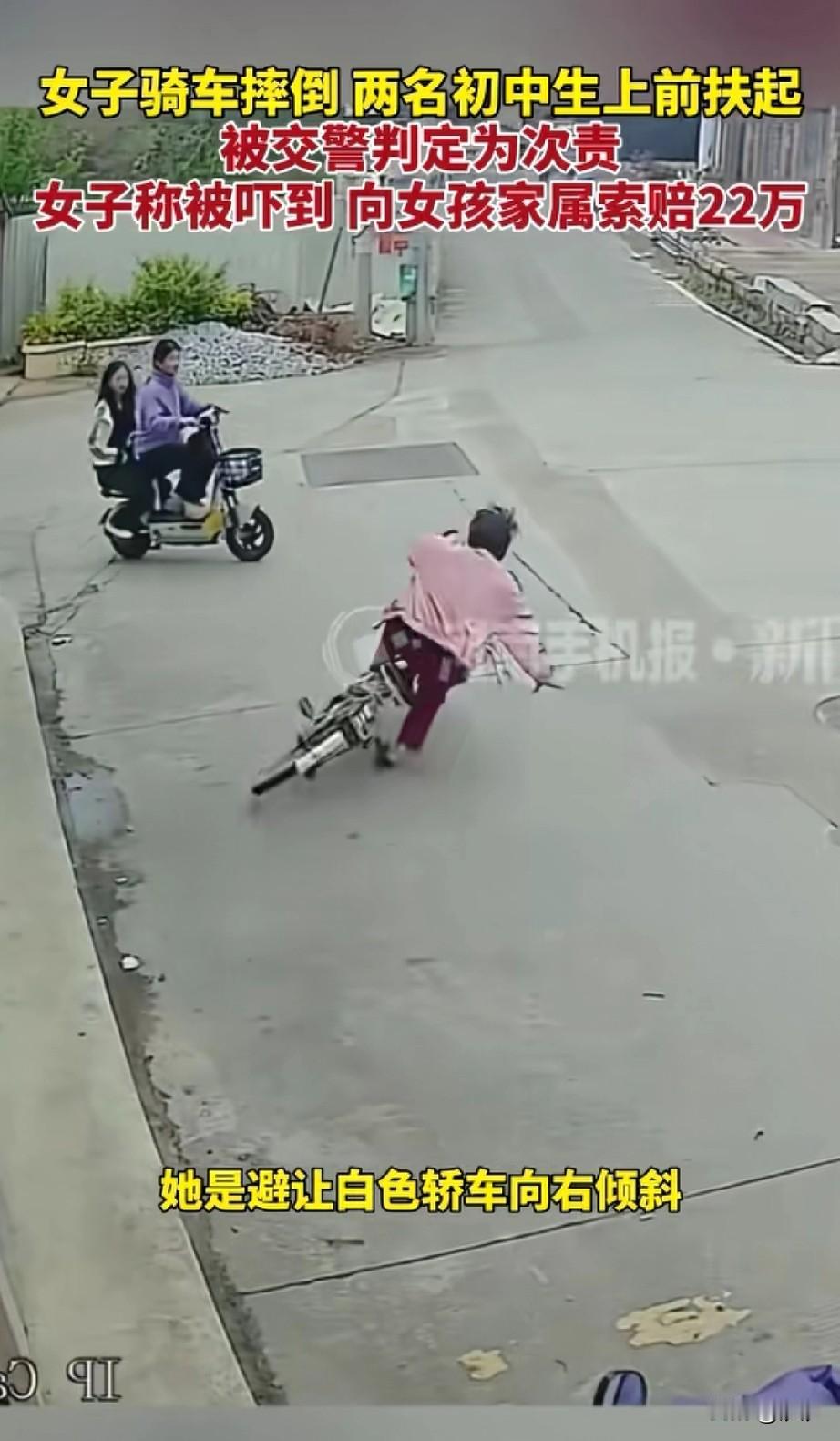 福建这起交通事故的争议, 大妈骑着自行车, 路过路口的时候, 一辆白色轿车右转弯别开了, 大妈被右转弯的车辆吓了一跳, 随后开始往右拐, 这个时候两名初中女孩骑着小电驴刚好过来,大妈随后一歪,直接摔倒, 刚好路边的监控拍下了完整的一幕, 两个女孩正在犹豫要不要扶大妈, 其中一名女孩说扶就扶呗… 一扶不要紧, 这回可摊上事儿了, 大妈表示自己是被她们吓到的, 向家属索赔22万元, 做好事儿的变成了负责任的人, 说好的扶人不担责, 这下好了还要赔偿22万元, 福建这起交通事故真的让人很无语, 女孩的妈妈经过这事, 孩子心里都有了阴影, 关键这还是有全程监控的, 这都说不清楚, 那些没有监控的地方, 谁还敢去扶老人, 毕竟现在动辄就几十万的赔偿, 大家对于福建这起交通事故怎么看? 福建扶老人被讹 你支持维权赔偿吗