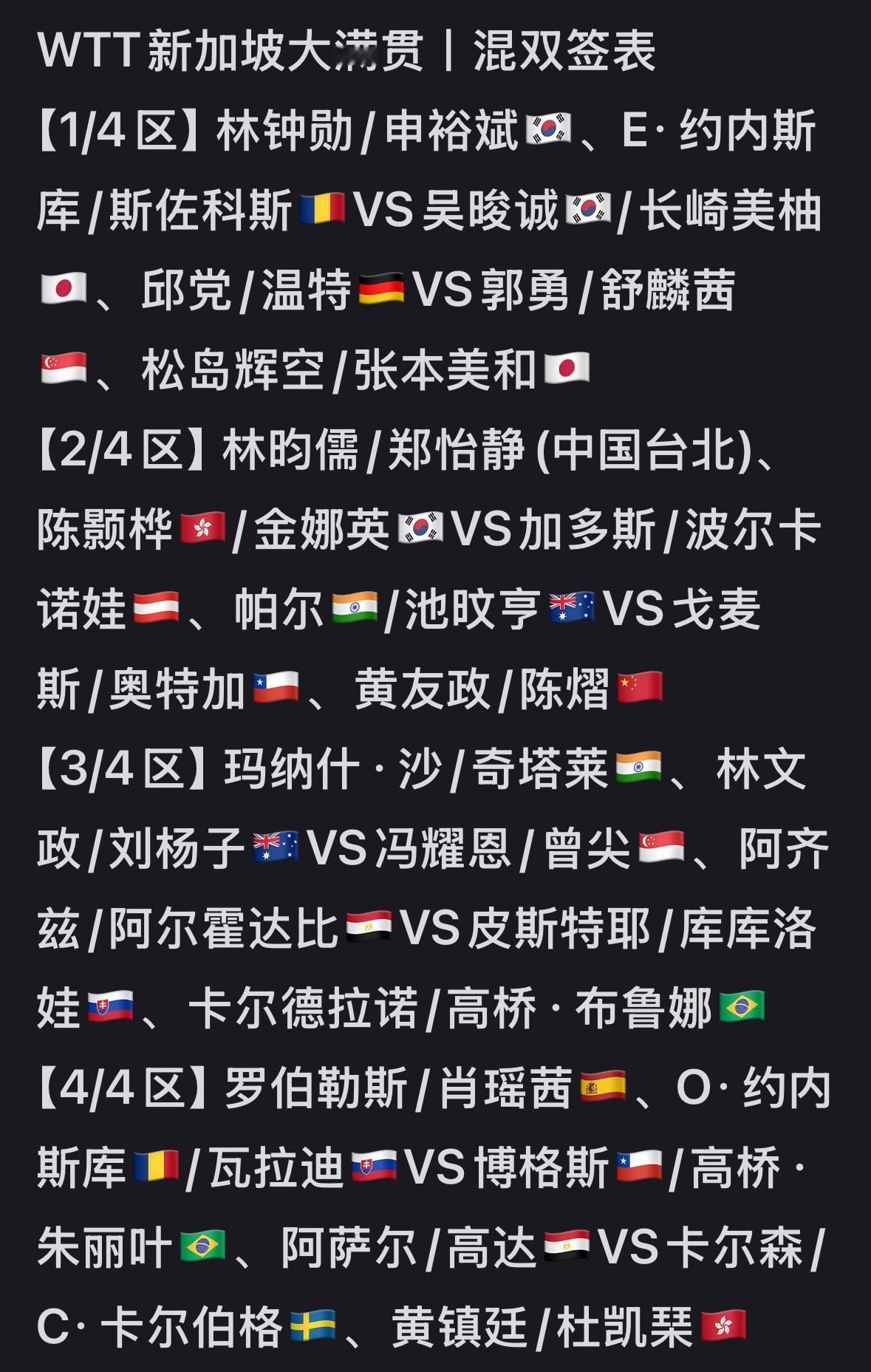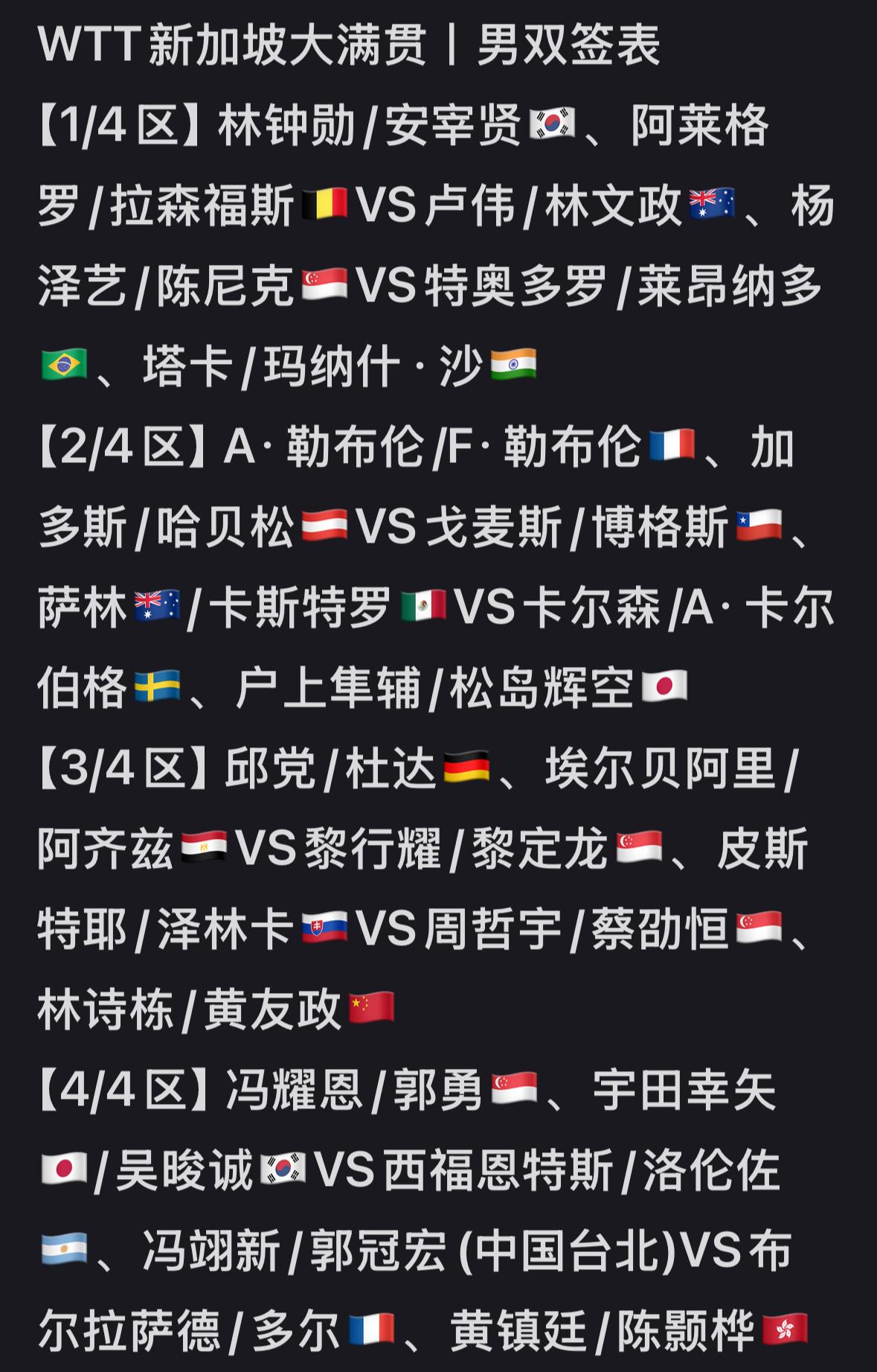 林诗栋与筱塚大登的头对头全记录——新加坡大满贯林诗栋加油冲! 2026新加坡大满贯男女单打签表 出炉, 林诗栋首轮对阵筱塚大登, 而且林诗栋与王楚钦同住上半区, 从以往的交手记录来看, 林诗栋对筱塚大登保持 4战皆胜的大好局面, 最后一次交手是在去年的亚锦赛上, 林诗栋3:2筱塚大登, 打得不太轻松, 希望这一次, 林诗栋可以轻装上阵, 放下一切压力, 拼好第一轮, 相信林诗栋在这次新加坡大满贯赛事中可以延续去年的好运气, 继续夺得冠军!