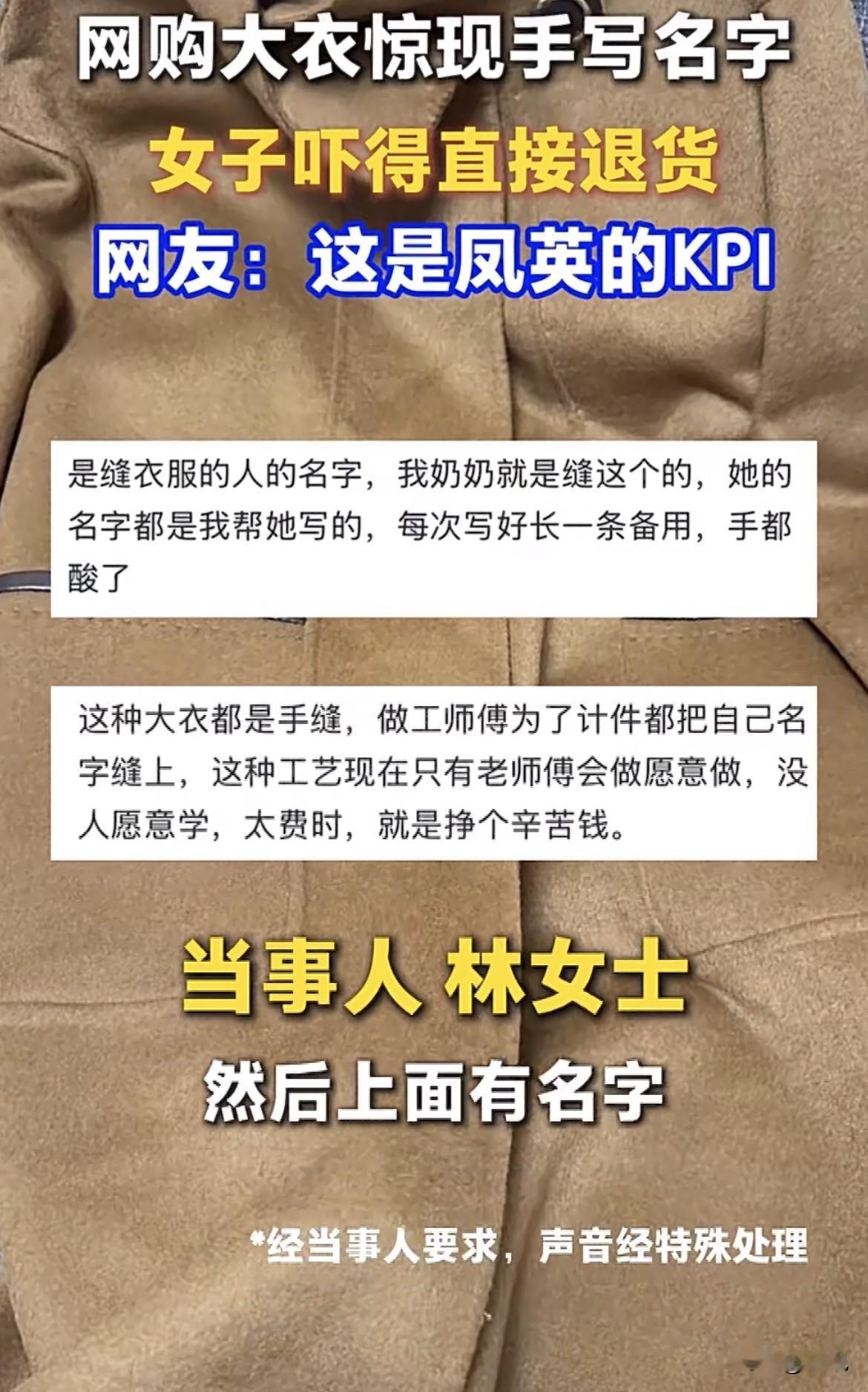 家人们谁懂啊,福建龙岩的林女士,她妈不是在直播间抢了件大衣嘛。过年了,老人家想添件新衣裳,高高兴兴在家里试穿。结果衣服刚上身,翻领子的时候手一僵——领子内侧,白底黑字,清清楚楚缝着个手写的姓名条。 林女士她妈当时心里就咯噔一下。大过年的,新衣服上咋还缝着别人的名儿?这多不吉利啊,跟穿了件二手货似的。老人家脸色当时就变了,让闺女赶紧把这衣服退了,心里还嘀咕这直播间的东西就是不靠谱,看着挺好,到手净是幺蛾子。 林女士也挺郁闷,就把这事拍了照片发网上,想吐槽一下这糟心的购物经历。帖子写得很简单,就说直播间买的大衣有别人名字,膈应人,准备退。 结果这帖子一发出去,评论区直接炸了,风向完全不是她想象的那样。 评论区里涌出来一堆明白人,有人说妹子你退早了!这哪是旧衣服啊,这恰恰说明你买到的是真正的纯手工制作的大衣!那些有经验的老裁缝,厂里计件算工钱,一天缝那么多件,谁做的怎么记?人家就在自己缝的衣服上做个记号,缝个名字条是最原始也最实在的办法。这名字就是人家师傅的工号,是他的KPI啊。 还有懂行的人说得更细,这种带名字的反而更金贵。为啥?因为这等于这件衣服是哪个师傅做的,一查就知道。以后万一真穿出啥质量问题,开线了掉扣子了,想返工或者追究责任,人家厂里直接就能找到这个人,这叫精准追责。不像那些机器大批量生产的,出了问题你都不知道找谁。这名字条,相当于这件衣服的身份证。 有网友还翻出老裁缝的传统,说以前的手艺人,剪刀、尺片、画粉,随身带个小布袋就能上门做活。那时候没缝纫机,全靠一针一线手工缝,一件衣服做下来费老大功夫。现在还能买到这种留名的手工大衣,就跟捡着宝一样。 这下评论区彻底变味儿了。刚才还替林女士打抱不平的,转头就开始疯狂求链接,问是哪个直播间,还有没有货。说这种有师傅签名的大衣上哪买去?这才是真正的工匠精神啊,现在满大街机器做的衣服,千篇一律,这种一针一线缝出来还带师傅签名的,太有温度了。 有人还开玩笑,说这名字要是叫"秀英""素芳",那这件大衣就是"秀英造""素芳牌",质量绝对杠杠的,买到就是赚到。甚至有人出主意,说林女士你别退啊,赶紧问问卖家能不能指定师傅,点名要这个师傅缝的。 林女士这下彻底傻眼了。她翻出那件大衣,又盯着那个手写的名字看了半天,这才注意到那字迹工工整整,确实不像随便写的。她妈在旁边也是后悔得不行,说光顾着害怕了,早知道这是人家师傅的工号,说啥也得留下来。 这事有意思的地方在于,林女士和她妈的第一反应,是觉得晦气、不吉利。因为在大家的常识里,新衣服就应该是干干净净、没有任何别人痕迹的。但凡出现点"异常",第一反应就是"这衣服有问题"。 可谁能想到,这个"异常",恰恰是它最珍贵的地方。 咱们现在买东西,特别是直播间里,听到的都是什么"源头工厂""大牌尾货""专柜撤柜"。主播拿着衣服轮番展示,揉面料给你看质感,甩袖子给你看版型。可有多少人知道,你盯着屏幕看的那件,和快递给你寄来的那件,可能根本就不是同一件?有业内人士爆料,很多直播间玩的是AB货,主播身上穿的是精挑细选的A版样品,成本几百块,给你发货的是偷工减料的B版货,成本几十块。 那些衣服,表面光鲜,可你翻遍每一个角落,找不到任何一个工人的痕迹。因为流水线上的工人,不配留名。 而林女士退掉的这件呢?一个素不相识的缝衣师傅,可能是个干了半辈子的老裁缝,也可能是个手脚麻利的中年大姐,在完成这件衣服的最后一道工序时,拿起针线,一针一针把自己的名字缝了进去。他没想过留名是为了让人夸,就是为了月底算工钱的时候,能清清楚楚地数出来,这个月做了多少件。 就这么简单,就这么朴素。 有网友说得特别到位,现在去商场买衣服,标签上写的是品牌名、设计师名,唯独没有那个真正把它一针一线做出来的人的名字。反倒是这种老式的工厂,还保留着最原始的计件方式。这个手写的名字,不是什么大牌logo,但它代表着这件衣服,是某个具体的人,用具体的手,一针一线做出来的。 林女士后来跟帖说,衣服已经退了,追不回来了。但这件事让她想了很久。她说以后再买衣服,如果看到里头有手写的名字条,肯定不会急着退了。 这事也给大伙提了个醒,以后再在衣服里头看到这种手写名字,先别急着上火。说不定你淘到的,就是件隐藏款,是某个老师傅一针一线缝出来的心血。那些手写的笔画里,藏着的不是什么晦气,而是一个手艺人最朴实的印记。 你有没有在衣服上见过这种名字条?如果见着了,你会留着还是退掉?
