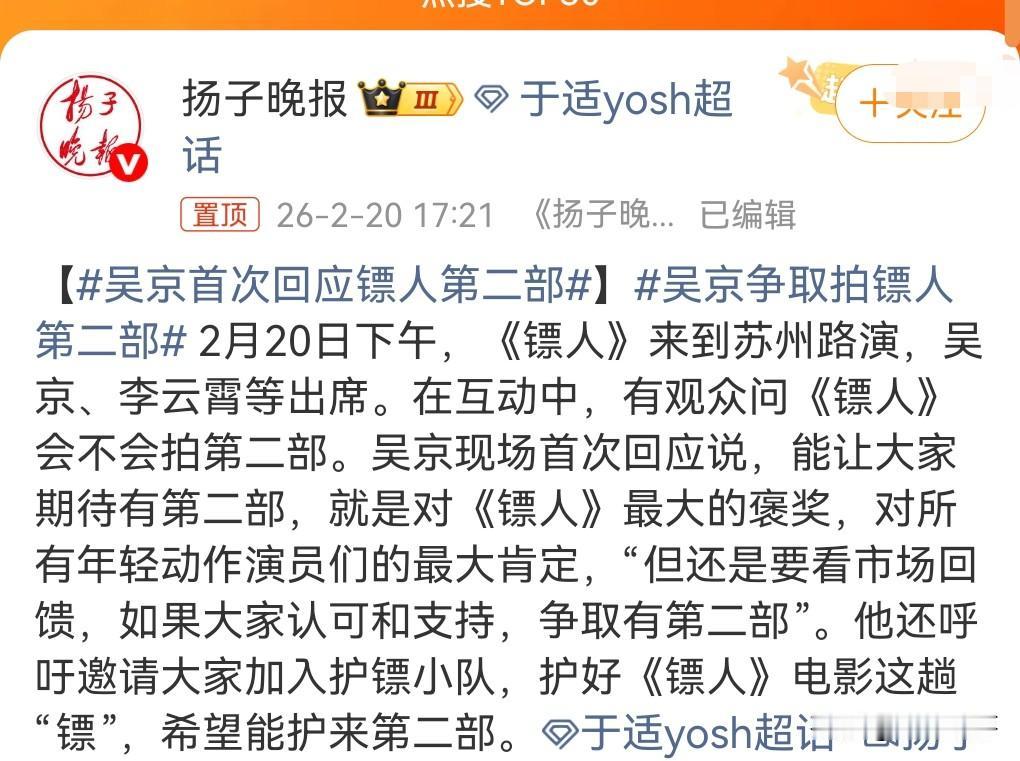 《镖人》票房逆跌,很多人催更第2部,看来大家对这部电影还是有那么点兴趣的。 吴京也对此进行了回应,争取拍镖人第二部。 不过2026年春节档最大赢家是沈腾主演的公路喜剧片《飞驰人生3》。 当然能不能拍第2部,得看第1部票房够不够好。 我还是希望能够有第2部的,毕竟这种类型的电影以后可能会越来越少。 中国的动作片貌似已经不是市场主流了。 如果能够看一场酣畅淋漓的动作片,那确实挺过瘾的。