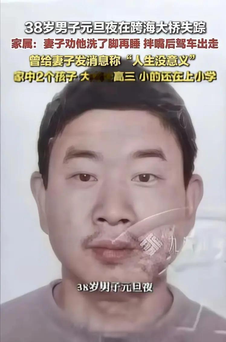 压倒骆驼的最后一根稻草。福建泉州,一38岁男子回到家里,立刻就想上床休息,谁知被妻子拦住,要他先洗脚再上床,为了这点小事,俩人发生了吵架,男子一气之下,开车来到了跨海大桥,他打开双闪,将车停在应急车道,他给妻子发了条消息:“人生没有意义。”又给妻子妹妹发了条消息:“妻子就交给你照顾了。”妻子急了,赶忙给他回拨电话,可电话无人接听,警方赶到了现场,发现男子手机等随身物品都放在车里,人却不见了踪迹。 这件事发生在2026年元旦的深夜,地点是福建泉州湾跨海大桥。 当事人是38岁的河南男子张某,他来泉州打工已经20年了,从18岁揣着借来的500块钱过来,一开始在石狮流水线当普工,后来去工地做水电工,一辈子老实本分,不抽烟、不喝酒,连花呗都很少用,省吃俭用攒钱,就想给老家的两个孩子全款买套房子,大儿子明年要高考,小儿子刚上小学,妻子在家照顾老人和孩子,他是家里唯一的顶梁柱,家里所有的开销都靠他一个人。 那天晚上,张某跟朋友聚了个餐,喝了两罐啤酒,快11点才拖着疲惫的身体回家,累得脱了外套就想往床上躺,他妻子顺口说了一句,让他先洗了脚再睡,说新换的床单别弄脏了。 本来就是一句家常话,可那天张某不知道是太累了,还是心里的火气攒得太久了,突然就发了火,说自己累得要死,洗什么脚。 他妻子也有点委屈,觉得自己就是随口提醒一句,没必要发这么大脾气,俩人就吵了两句,没吵多凶,但张某没再多说,抓起车钥匙就摔门出去了。 他妻子一开始没太在意,以为他就是出去散散心,冷静一会儿就回来了,以前俩人也偶尔吵两句,张某最多出去转两圈就会回来。 可等到晚上11点 40 分,她的手机收到了张某发来的微信,就六个字:“人生没有意义。” 她一下子就慌了,赶紧给张某回拨电话,没人接,发视频也被挂断了,那一夜,她打了上百个电话,直到天亮,实在没办法,才颤抖着报了警。 警方接到报警后,很快就展开了搜寻,1月2号下午,高速交警在泉州湾跨海大桥的应急车道上,找到了张某开的白色轿车。 那辆车的双闪灯还亮着,只是光线已经很微弱,显然亮了一夜早就快没电了,车门也没锁,一拉就开,副驾驶座上,张某的手机、钱包、身份证都在,钱包里还有3000多块现金,银行卡也一张没少,看得出来,他走的时候很匆忙,也没打算带走这些东西。 监控只拍到张某驾车上桥的画面,后来因为天黑、距离远,再加上来往车辆的大灯干扰,画面很模糊,根本看不清他把车停好后去了哪里。 张某的弟弟从无锡请假赶过来,花光积蓄雇了带热成像的无人机搜海,一次就要1500块钱,连着飞了4天,花了快一万块,救援队却说,海水太急,底下全是暗礁和渔网,就算有线索,也被冲没了。 他的老父亲从河南老家赶来,每天沿着海岸线走10公里,鞋都磨破了两双,逢人就问有没有见过自己的儿子,嘴里反复念叨着,我儿咋这么傻。 很多人都说,不就是因为洗个脚吵个架,至于吗?其实根本不是这一件小事的问题。张某来泉州打工20年,每天起早贪黑干活,老板让加班就加班,工友找他帮忙从不拒绝,每个月工资除了留500 块生活费,其余的全打给妻子,家里的事大多都是妻子拿主意,他连给孩子买个玩具,都要先跟妻子商量,去年他想换个新手机,旧手机屏都裂了,妻子说还能用就别换,他就真的没换。 他心里的委屈和疲惫,从来没地方说,不敢跟父母说,怕他们担心,不敢跟孩子说,怕影响他们,跟妻子说,可能也没得到过真正的理解。这些压力攒了20年,就像一堆慢慢堆起来的石头,越堆越多,而那天晚上洗脚的争吵,就是最后一块石头,一下子把他压垮了。 他给妻子发 “人生没有意义”,给妻妹发 “妻子就交给你照顾了”,不是一时冲动,是他真的觉得撑不下去了,这是他在跟家人做最后的告别。 张某的妻子这些天一直守在派出所,眼睛肿得像核桃,反复念叨着,早知道就不说让他洗脚的话了,早知道就多跟他说两句软话。 她也没想到,一句平常的提醒,一场普通的争吵,会酿成这样的悲剧。警方现在还在调周边73个监控,想拼出张某弃车后的轨迹,他的家人也没放弃,说就算找十年,也要找到他。 这件事说到底,就是夫妻之间少了点体谅,中年男人的压力,往往都是无声的,他们看着坚强,其实心里很脆弱,常年的辛苦和委屈,只要一句不被理解的话,就可能彻底崩溃。 过日子哪有不吵架的,可吵归吵,多站在对方的角度想想,多说说软话,就不会走到这一步。 现在张某还是失踪状态,没人知道他到底在哪里,只希望能有奇迹出现,也希望更多家庭能从这件事里吸取教训,多体谅身边的人,别等失去了才后悔。 信源:网易新闻客户端---一句“洗脚”引发的失联:中年男子深夜出走,消失在大桥上