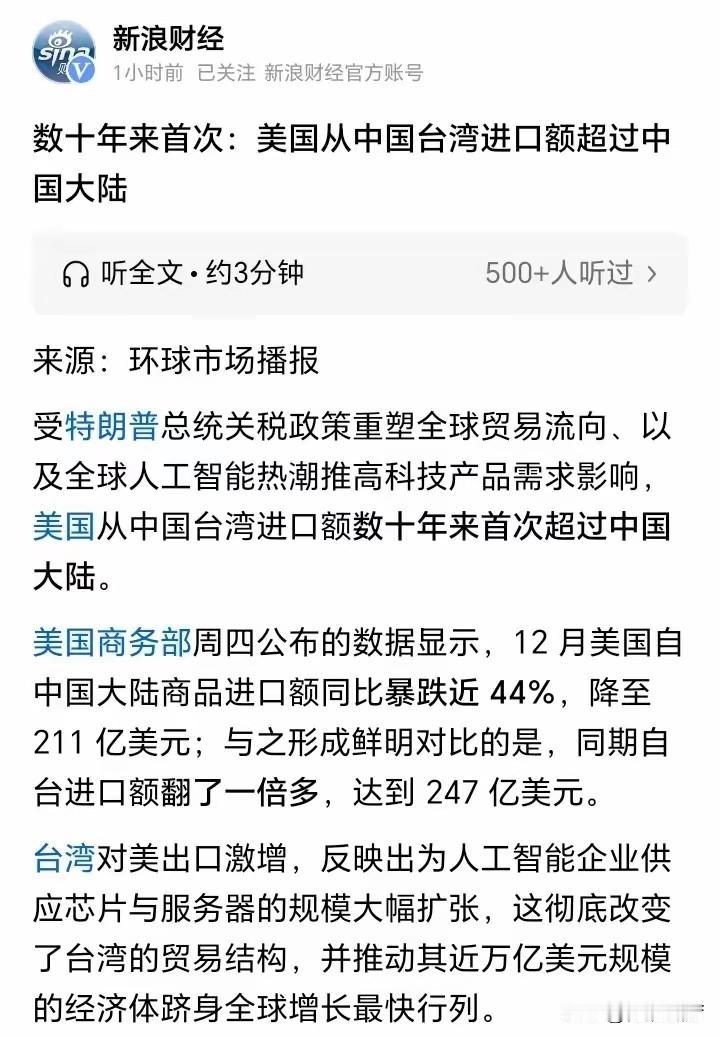 数十年来美国从中国台湾进口首次超过中国大陆。2025年12月美国自台湾进口额达到247亿美元,同比翻了一倍多,而从中国大陆进口额211亿美元下跌近44%。 ​造成这种变化的主要原因包括:特朗普政府对华加征高额关税,导致中国大陆出口商加速多元化布局、减少对美依赖。台湾企业则反其道而行之,去年美国吸纳了台湾近三分之一的总出口。台湾生产了全球90%的AI服务器,占据70%的半导体代工市场份额,12月台湾对美“信息、通信及视听产品”出口同比激增200%。 ​英伟达等公司对AI数据中心的大规模投资,极大地改变了台湾的出口格局。2025 年美国对华贸易逆差减少 934 亿美元,降至 2021亿美元;而对台贸易逆差则翻了一倍多,逼近 1470 亿美元。这种贸易格局的变化看似让台湾在对美贸易中“风光无限”,实则暗藏巨大风险。 从经济结构上看,台湾过度依赖对美高科技产品出口,一旦美国市场出现波动,或者全球科技产业发展风向转变,台湾经济将遭受沉重打击。比如,AI产业发展具有一定的周期性,当前英伟达等公司大规模投资AI数据中心,但未来若投资热度下降,需求锐减,台湾那些以AI服务器生产为主的企业将面临产能过剩、订单不足的困境。 从政治层面讲,美国将台湾作为其制衡中国大陆的棋子,所谓的贸易繁荣只是美国的权宜之计。美国不会真正关心台湾的经济发展,只是为了满足自身的地缘政治利益。一旦美国认为利用价值降低,很可能随时抛弃台湾,让台湾的经济发展陷入停滞甚至衰退。 而对于中国大陆来说,虽然对美出口额下降,但这也促使中国大陆加快产业升级和经济转型的步伐。出口商多元化布局的成果在未来会逐渐显现,中国大陆企业将在更广阔的国际市场中寻找机遇,提升自身的竞争力。同时,中国大陆庞大的内需市场也为经济的稳定发展提供了坚实的支撑。台湾地区不应被眼前的虚假繁荣所迷惑,而应该认清现实,积极寻求与中国大陆合作,共同推动两岸经济的健康发展。毕竟,只有两岸携手,才能在全球经济的浪潮中抵御风险,实现互利共赢。
