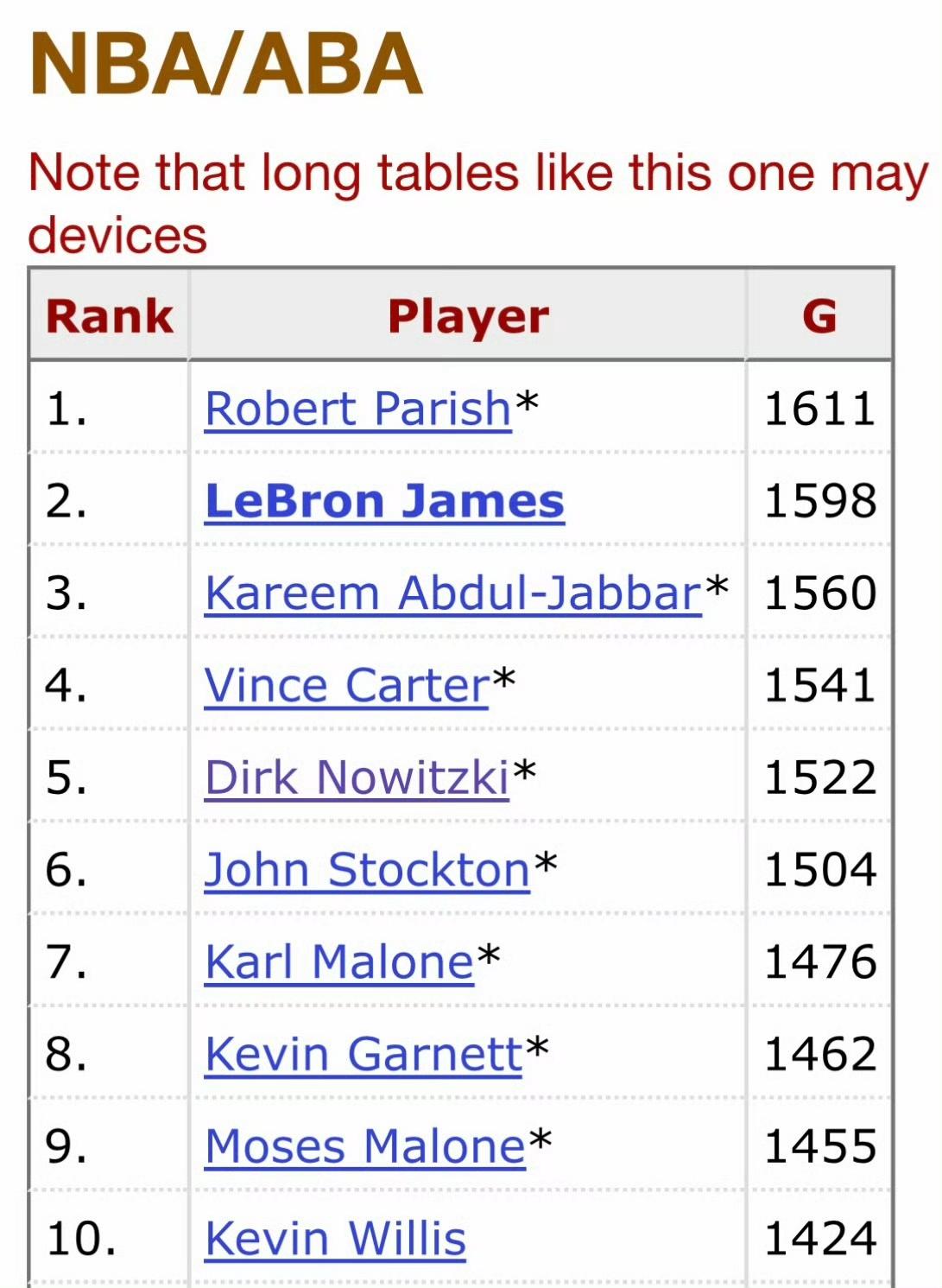 詹姆斯距离常规赛历史出场次数最多的帕里什还差13场比赛。本赛季有望达成。 詹姆斯目前常规赛生涯总得分是42975分,距离43000分大关只有25分。明天有望达成里程碑,希望不是里程悲……