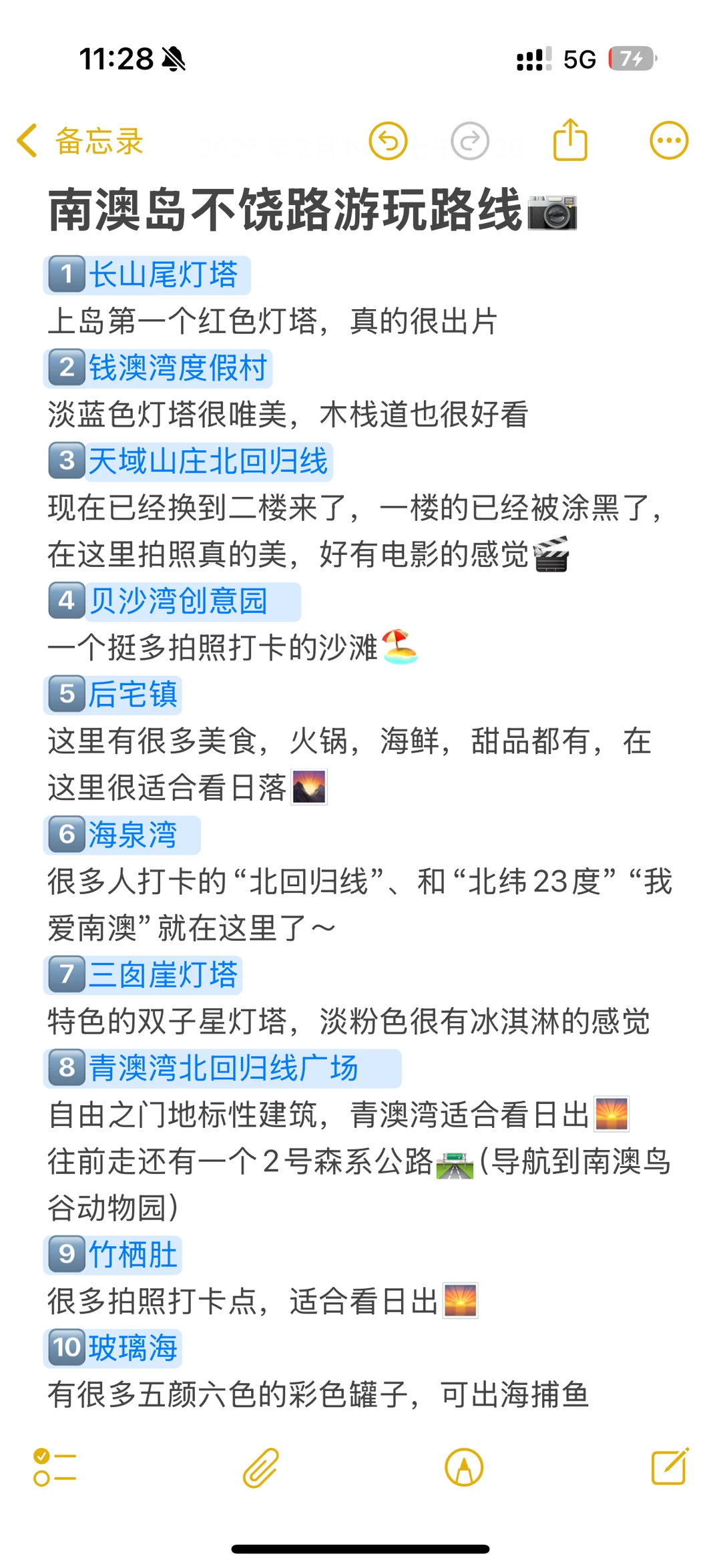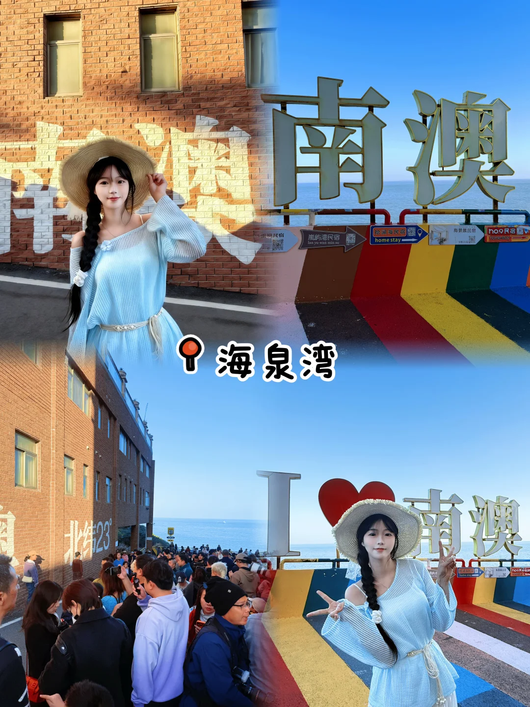 不得不说!这座小海岛真的太好拍了🏖️ 晴天更美☀️ 记住这个拍照机位路线📷不走回头路,一路拍一路玩 1️⃣长山尾灯塔 2️⃣钱澳湾度假村 3️⃣天域山庄北回归线 4️⃣贝沙湾创意园 5️⃣后宅镇 6️⃣海泉湾 7️⃣三囱崖灯塔 8️⃣青澳湾北回归线广场 9️⃣2号公路 🔟竹栖肚 1️⃣1️⃣玻璃海 📖小Tips 南澳岛晴天的时候还是挺出片的,中午的时候可以穿裙子,早晚温差大☀️ 景点隔得比较远,建议自驾出行🚗每个景点的停车费🅿️大概是10r-25r,千万不要停路边,不然会被罚200r🥹 南澳桥上岛要预约,建议8:00左右就要上岛,不然就会堵在桥上,不然会堵1、2个小时,上桥是96r(来回) 每个景点的拍照打卡点多很多人,建议大家找角度拍摄,只要自己表情OK😬可以后期消除人群 民宿千篇一律,记得要做好攻略,不然真的很坑,我住在青澳,房间也可以看到海景,看日出真的很美🌅 吃的建议在后宅,基本上都不踩雷,我们是喝了个小糖水🥣其他牛肉火锅海鲜感觉也还不错哦,建议大家先吃生再吃熟🦞 春节天气不错,趁着假期可以出发去海岛玩啦🏖️