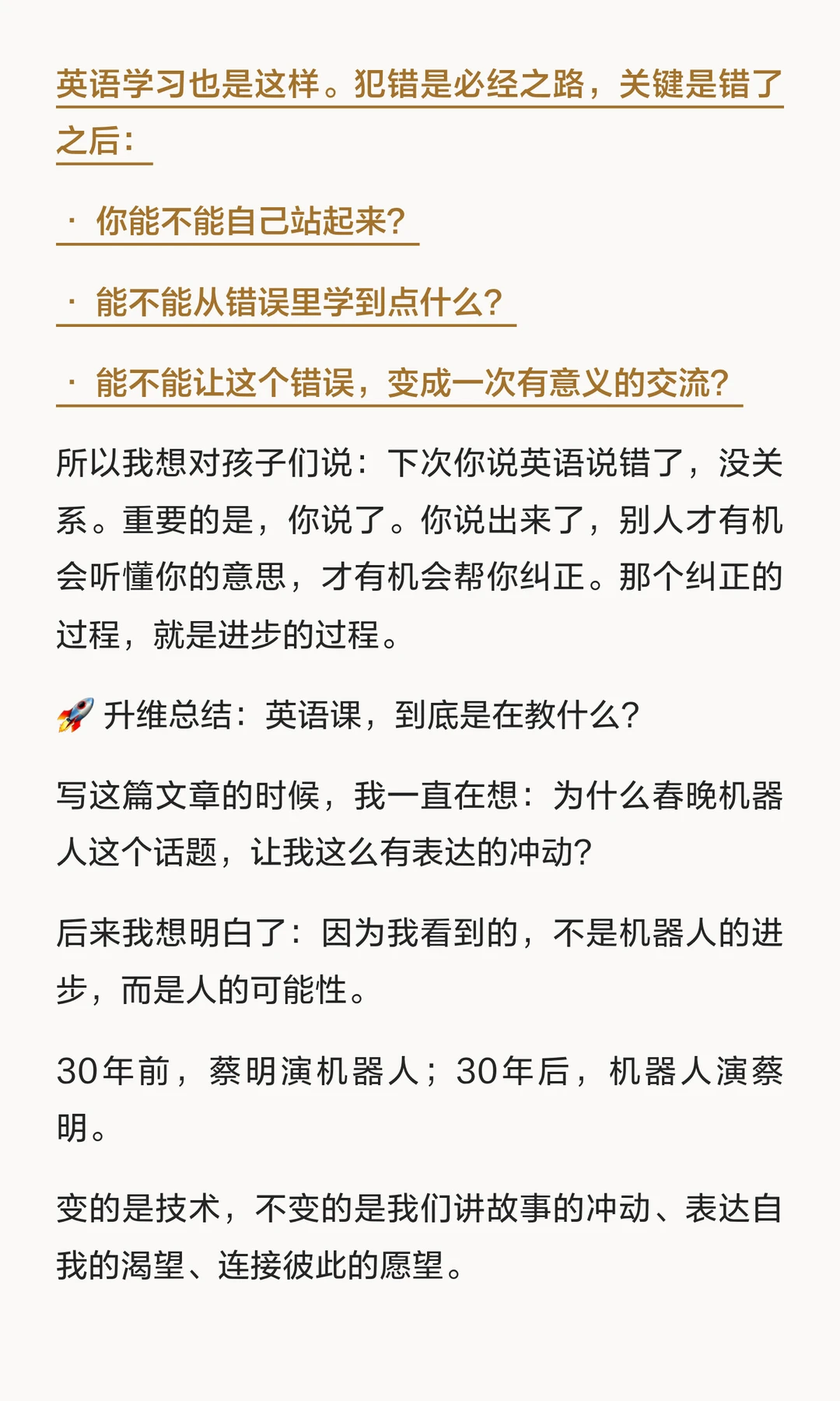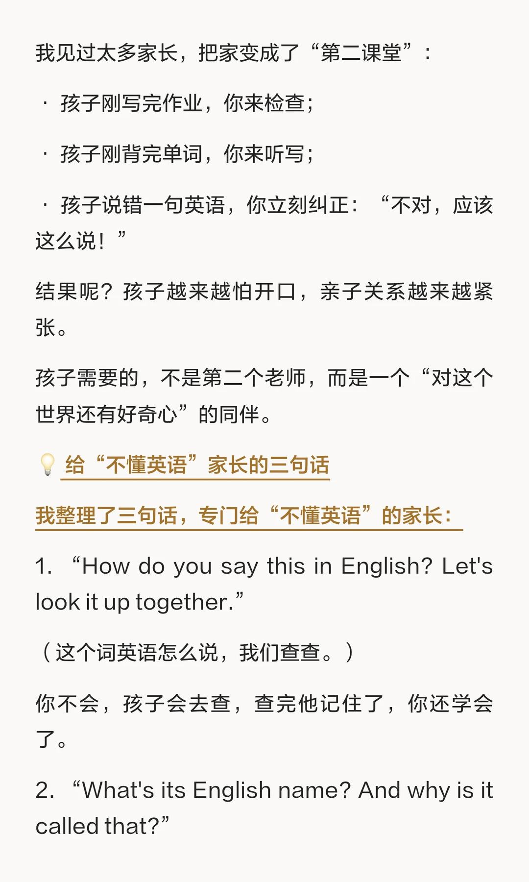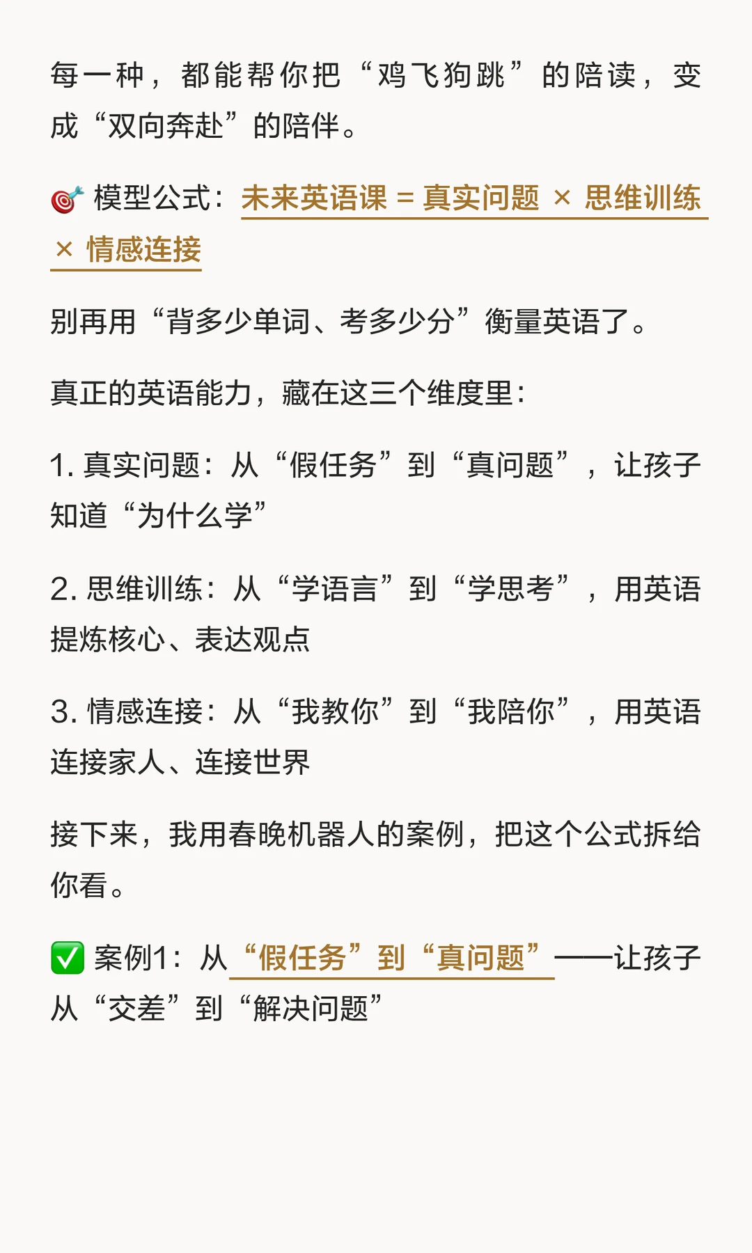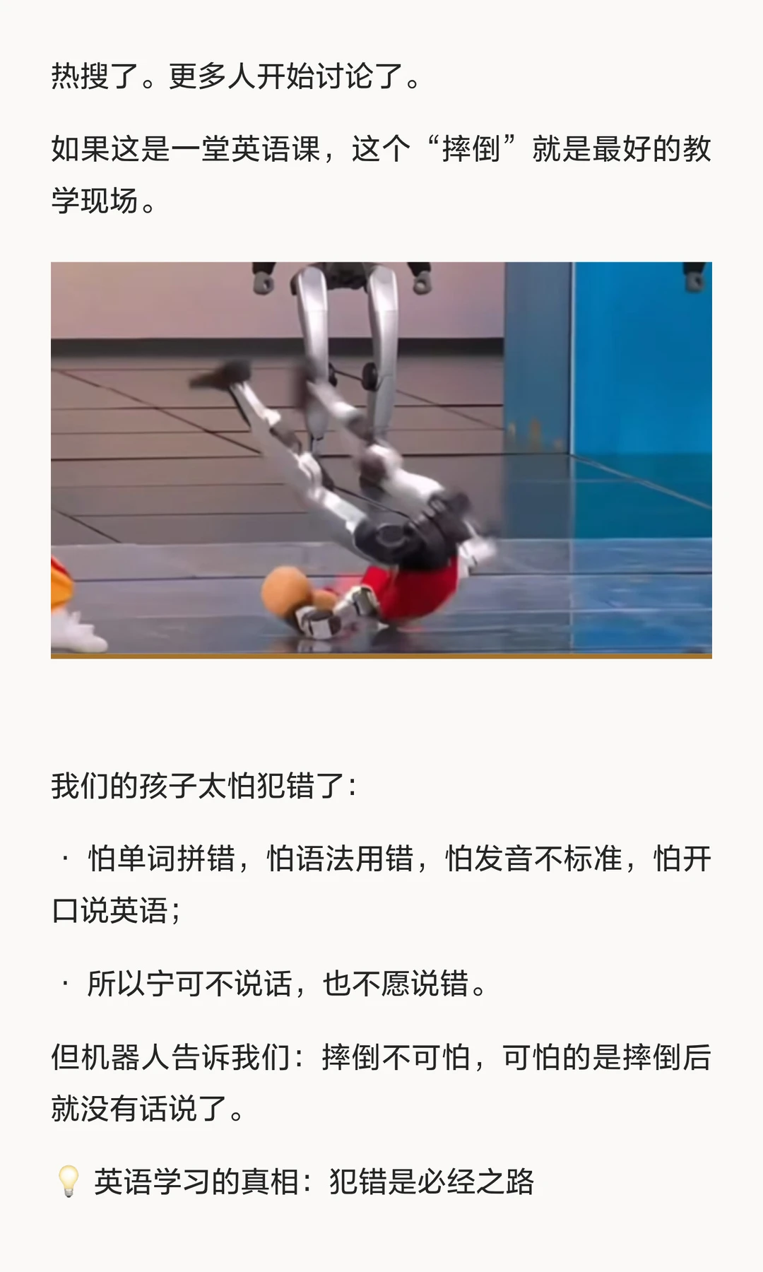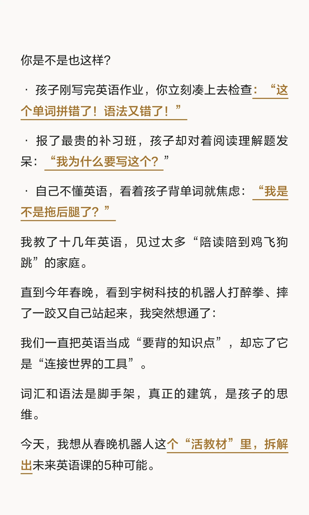 家有中小学生的爸妈,是不是天天被英语逼疯? 单词背了忘、忘了背📝 补习班烧钱无数,成绩一动不动 开口哑巴英语,考试全靠蒙 语法抠到死,一做题就废 每天陪读鸡飞狗跳,亲子关系濒临破裂… 我教英语十几年,很负责任地说: 你家孩子不是不聪明,是学错了方向! 英语根本不是死记硬背的学科,而是用来沟通、看世界的工具🌍 🔥 核心英语提分模型 未来英语能力 = 真实场景 × 思维训练 × 敢表达 别再盯着单词量、语法点,这三点才是提分关键! ✅ 真实案例拆解 ❌ 错误学法: 机械抄单词、死背课文、刷无效习题 孩子越学越抵触,完全不知道“为什么学” ✅ 正确学法: 把英语放进生活里—— 用英语介绍机器人、描述春晚、回复海外评论 孩子有目标、有身份、有动力 主动开口、主动查词、主动思考 效率直接翻10倍! 很多家长说:我不懂英语,怎么陪? 其实超简单,记住3句话👇 1. How do you say this in English? 我们一起查 2. Can you tell me about it in English? 用英语讲讲 3. Wow! You did it! 肯定+鼓励 你不需要当老师,只需要当同伴👨‍👩‍👧 不懂英语,照样能养出英语牛娃! 💡 升维总结 中小学生学英语,最忌讳: 死抠语法、盲目背词、害怕犯错 机器人摔了都能自己站起来 孩子说英语说错了,又有什么关系? 敢开口、敢表达、敢思考,比满分更重要 英语不是负担,是孩子看世界的眼睛👀 是未来最核心的竞争力 别再用老方法,耽误孩子黄金期!