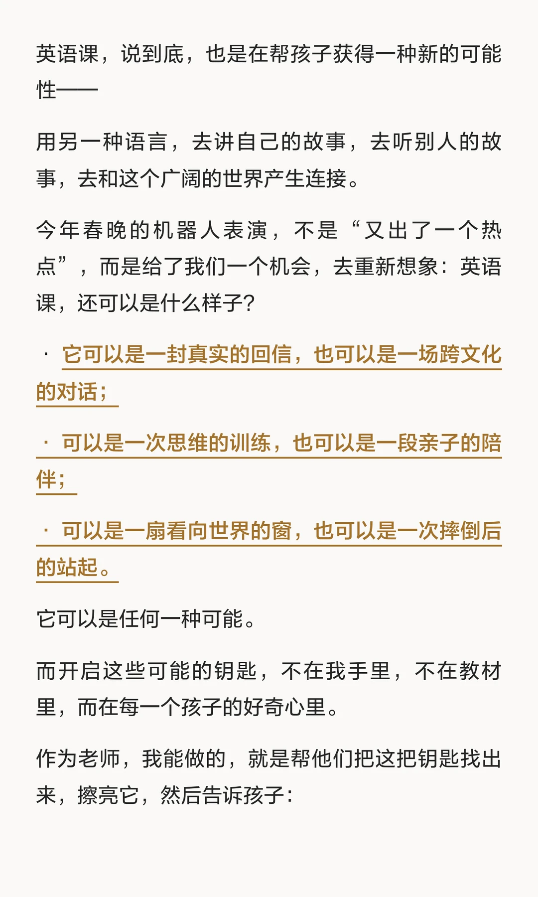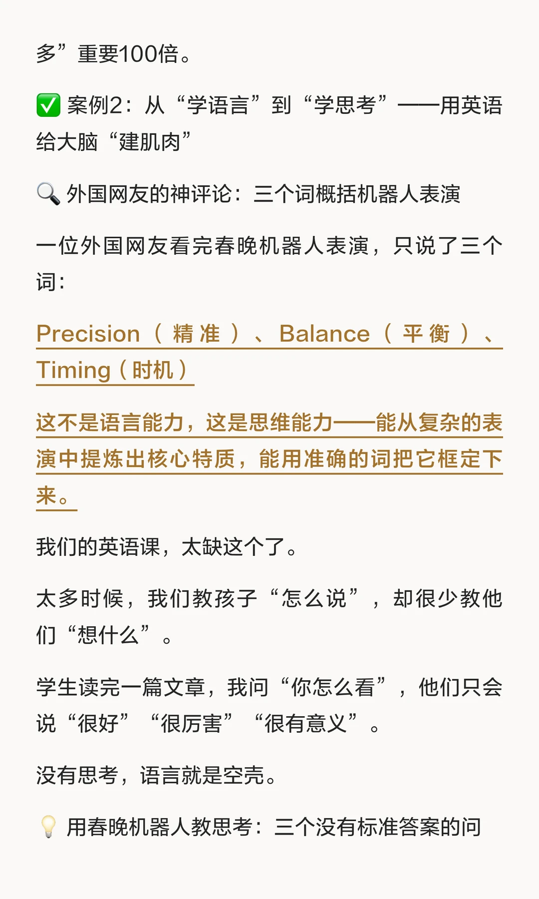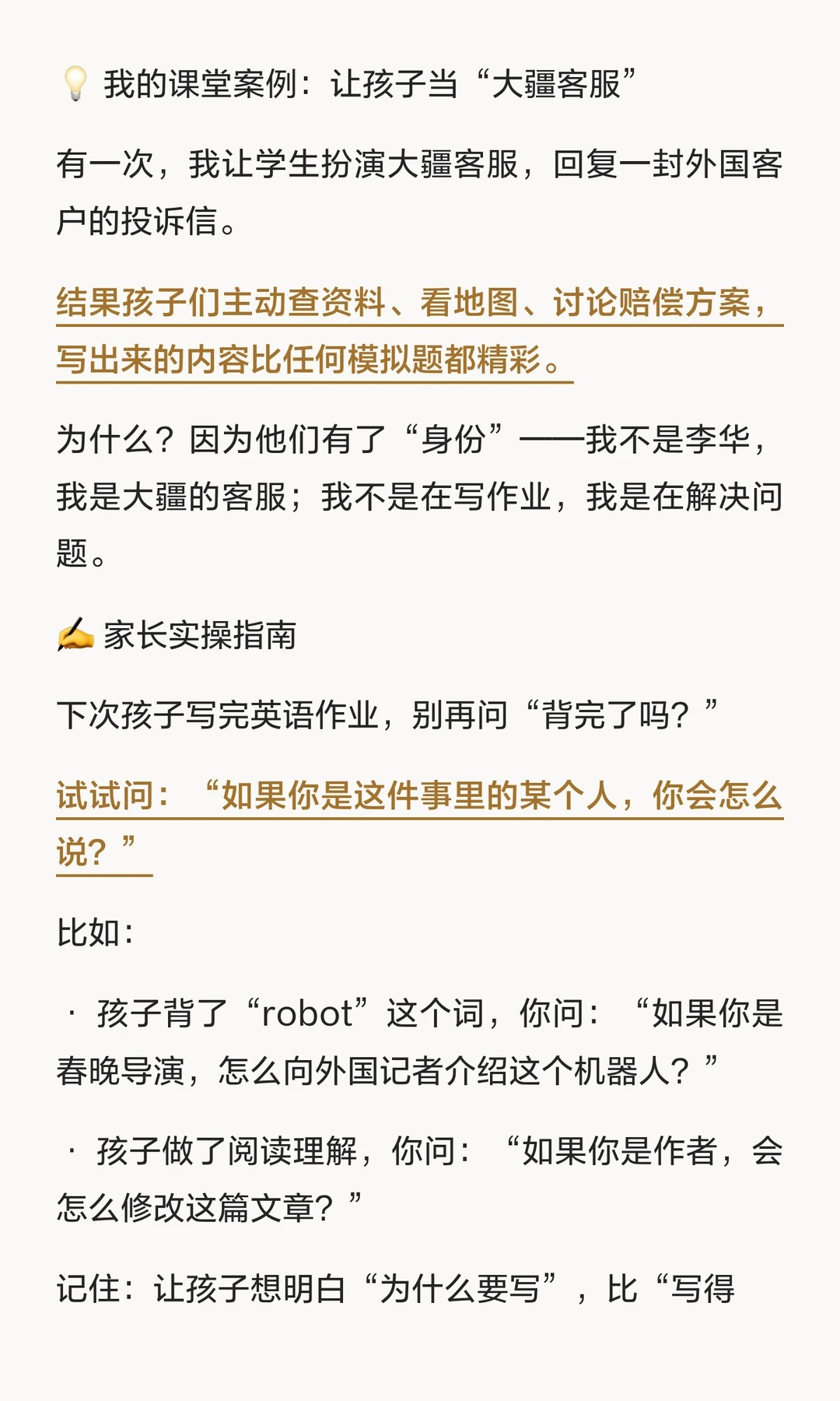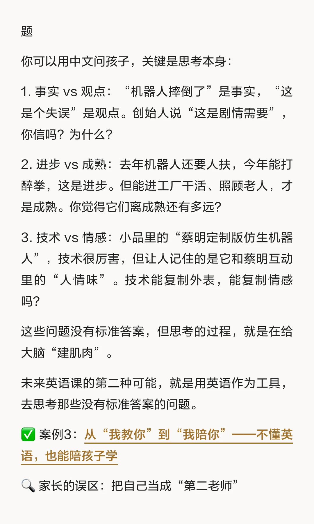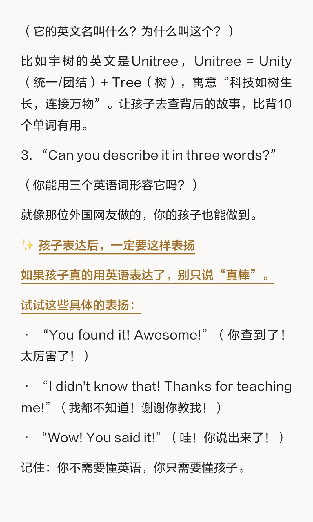 家有中小学生的爸妈,是不是天天被英语逼疯? 单词背了忘、忘了背📝 补习班烧钱无数,成绩一动不动 开口哑巴英语,考试全靠蒙 语法抠到死,一做题就废 每天陪读鸡飞狗跳,亲子关系濒临破裂… 我教英语十几年,很负责任地说: 你家孩子不是不聪明,是学错了方向! 英语根本不是死记硬背的学科,而是用来沟通、看世界的工具🌍 🔥 核心英语提分模型 未来英语能力 = 真实场景 × 思维训练 × 敢表达 别再盯着单词量、语法点,这三点才是提分关键! ✅ 真实案例拆解 ❌ 错误学法: 机械抄单词、死背课文、刷无效习题 孩子越学越抵触,完全不知道“为什么学” ✅ 正确学法: 把英语放进生活里—— 用英语介绍机器人、描述春晚、回复海外评论 孩子有目标、有身份、有动力 主动开口、主动查词、主动思考 效率直接翻10倍! 很多家长说:我不懂英语,怎么陪? 其实超简单,记住3句话👇 1. How do you say this in English? 我们一起查 2. Can you tell me about it in English? 用英语讲讲 3. Wow! You did it! 肯定+鼓励 你不需要当老师,只需要当同伴👨‍👩‍👧 不懂英语,照样能养出英语牛娃! 💡 升维总结 中小学生学英语,最忌讳: 死抠语法、盲目背词、害怕犯错 机器人摔了都能自己站起来 孩子说英语说错了,又有什么关系? 敢开口、敢表达、敢思考,比满分更重要 英语不是负担,是孩子看世界的眼睛👀 是未来最核心的竞争力 别再用老方法,耽误孩子黄金期!