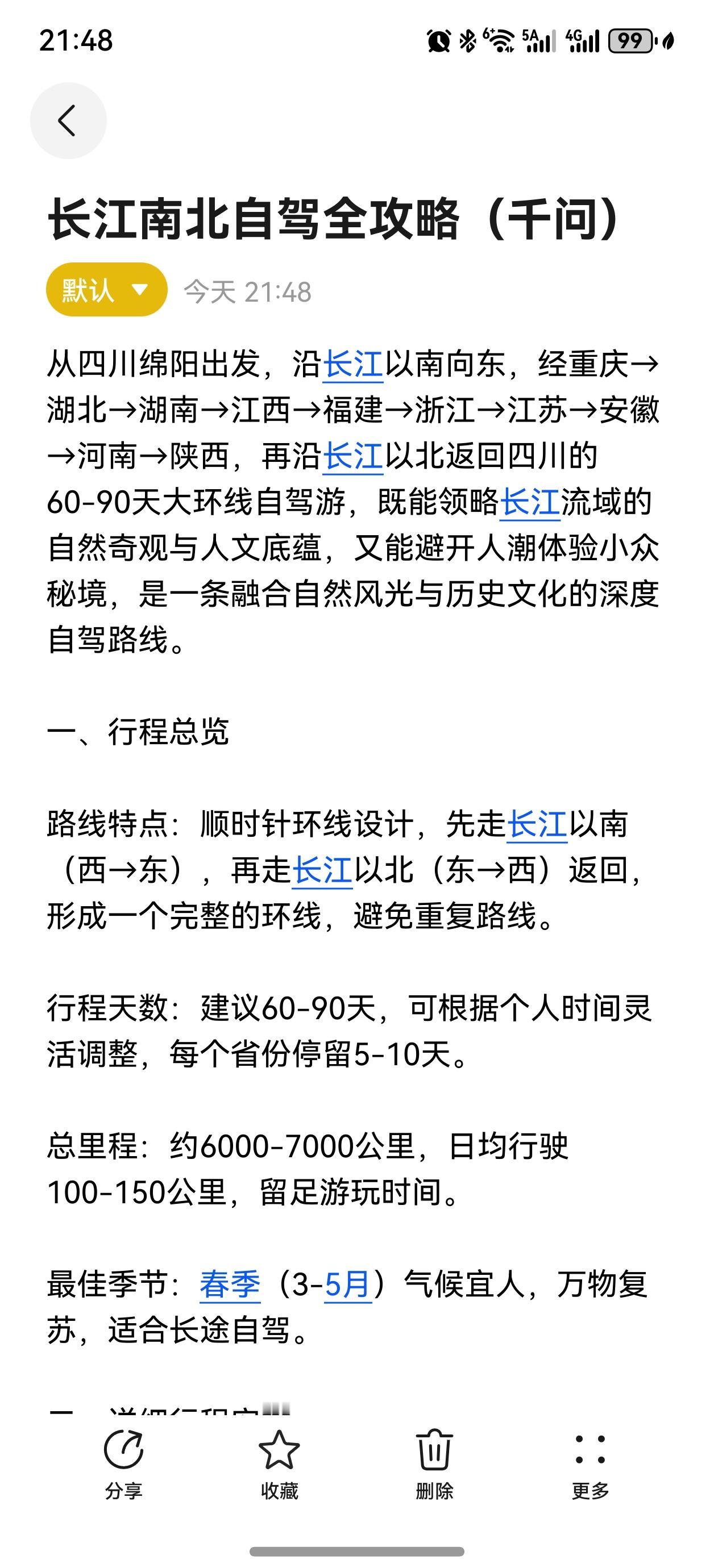 用DeepSeeK、千问和豆包做自驾游攻略,谁更优? 春天来了,准备开启新一年的自驾游行程。今年,我计划走长江南北,从四川出发,经重庆→湖北→湖南→江西→福建→浙江→江苏→安徽→河南→陕西,回四川。也就是先走长江以南,一路向东,再从长江以北回来。时间2至3个月。 我用DeepSeeK、千问和豆包,分别做了一个自驾游攻略,提示词完全一样。对比了一下,感觉DeepSeeK最敷衍,基本没有可操作性;千问比DeepSeeK做得好一些,有一定的可操作性;做得最好的是豆包,非常详细,可操作性很强。细化到了每一天,含盖行程、景点、美食和住宿等。 所以,3月份后,基本上按照豆包做的攻略,开启新一年愉快的旅行!