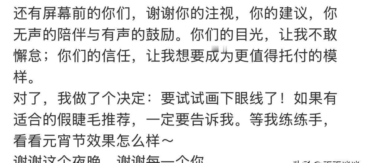 别再说龙洋“眼斜向上”了,她自己都听到了。 主持人龙洋回应,这可能跟她平时的眼线画法有关。 她不光听进去了,还打算改。 特别是下眼线,她要换个画法,甚至公开求推荐合适的假睫毛。 这事儿不小。 一个公众人物,为了观众的反馈,愿意直接调整自己的形象。 你可以不关注娱乐八卦,但这种认真听劝、立刻行动的态度,对我们普通人,难道不是一种启发? 下次元宵晚会,看她怎么“变脸”。
