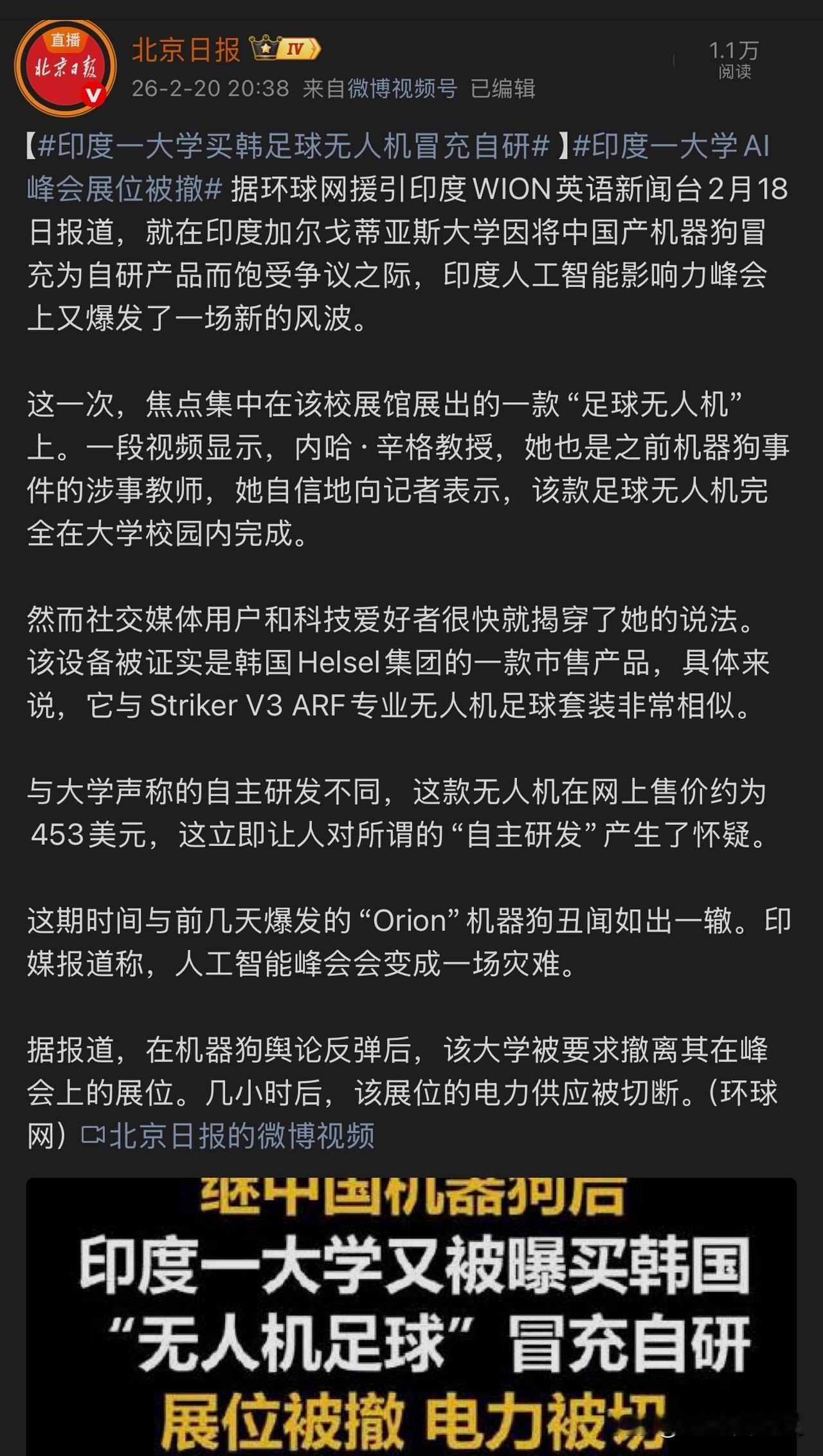 印度Ai峰会第四次洋相来了,这次是购买韩国足球无人机来冒充自研,结果肯定是喜提撤销展位和切断电力!此前三次出洋相分别是开幕混乱无序,部分参展商品无故丢失、购买中国机器狗冒充自研和泡沫不干胶残缺粗糙无人机。我觉得印度这次Ai峰会充分体现了其民族特性,之前在网络上形成的诸多刻板印象看来并非空穴来风。所以,这种造假、差不多讲究和盲目自信的态度如果不从其民族文化中予以剔除,那么其国际形象和治学态度将会越来越差。像这次出现的四大洋相如果只是撤展了事儿,没有相应的处罚机制,那犯事儿成本也实在是太低了,与无比巨大的收益相比简直是洒洒水了。记录我的2026