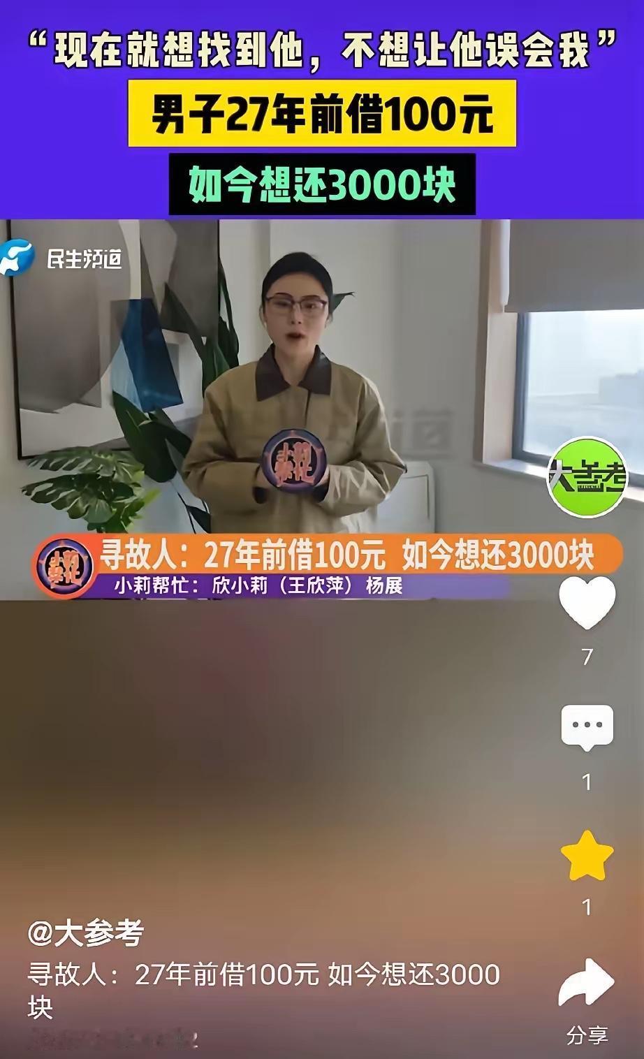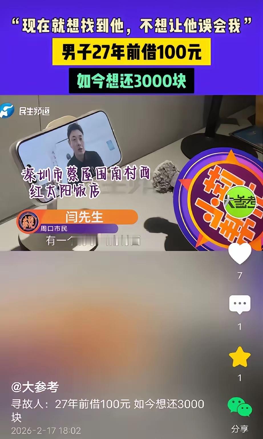 这才是真汉子!河南周口,男子一直找不到工作,身无分文,走投无路之下跟朋友借了100块钱,谁料,一个月后男子去还钱,朋友却辞职离开了,他四处打听朋友下落依然杳无音讯。27年过去了男子一直没办法还钱,他找到媒体帮忙:我想要找到他,我不想让他认为我是一个不诚信的人。网友:一诺千金,重情重义。 27年的时光,能磨平生活里的诸多棱角,能让陌生的街道变得熟悉,能让年少的轻狂变成中年的沉稳,却没能让这名周口男子放下心里的牵挂。他记着的从来不是100块钱的数额,是朋友在他走投无路时毫无保留的信任,是自己当初许下的还款承诺。 上世纪九十年代末,普通劳动者的月均收入不足400元,100块钱能支撑一个人解决多日的食宿问题,能帮陷入绝境的人找到喘息的空间。男子当时求职接连受挫,口袋里没有一分余钱,连最基本的生存都成了难题,朋友没有迟疑就把钱交到他手上,这份出手相助,是困境里最难得的温暖。 他满心想着尽快归还这笔钱,不想让朋友为自己担心,一个月后好不容易凑齐钱款上门,却得知朋友已经辞职离去。他跑遍两人常去的地方,挨个询问共同相识的熟人,哪怕只有一丝线索也不愿放过,可朋友就像断了线的风筝,再也没有半点消息。 这些年他组建了家庭,有了稳定的生活,经济条件早已摆脱当年的窘迫,可只要想起这笔未还的钱,内心就满是不安。他见过身边有人借了小钱刻意失联,见过有人以时间久远为借口推脱责任,这些现象让他更清楚,自己不能成为那样的人。 他主动联系媒体寻求帮助,没有半点博眼球的想法,只是想借助更多渠道找到当年的朋友。他对着镜头说得诚恳,他不怕别人说他较真,只怕当年帮助自己的人,误以为他是忘恩负义、不讲诚信的人。 当下的生活节奏越来越快,人与人之间的信任变得格外珍贵,总有人把小额借款当成小事,把随口的承诺当成儿戏。这名男子用27年的坚守,打破了人们对诚信的刻板认知,诚信从不是挂在嘴边的标语,是无人监督时依然坚守的底线,是时隔多年依然不变的初心。 网友说他一诺千金、重情重义,这份认可他当之无愧。他没有做出轰轰烈烈的壮举,只是守住了做人最基本的准则,不辜负他人的善意,不丢失自己的品行。当年朋友的雪中送炭,是情分;27年的执着寻友,是本分。 他用实际行动告诉身边人,善意从来不会被辜负,诚信也从来不会被时间冲淡。人与人之间最长久的联结,不是金钱往来,是彼此信任、相互成全的真心。 坚守诚信从来都不是一件容易的事,可正是这份不容易,才让这份坚守显得格外珍贵。不管时代如何变化,不管金额大小,答应别人的事就要做到,欠了他人的情就要偿还,这是做人的根本,也是立身的底气。 各位读者你们怎么看?欢迎在评论区讨论。