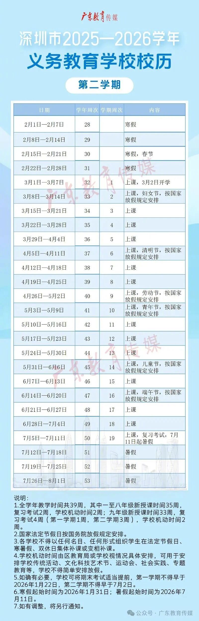 普通高中阶段寒假开始时间:2026年2月7日春季学期开学:2026年3月2日暑假开始时间:2026年7月11日来源:广东教育传媒 深圳大件事综合