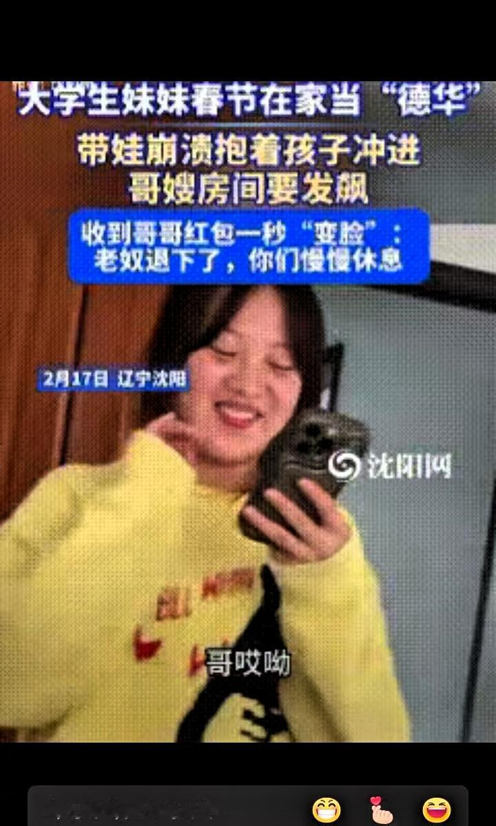 “不当影后真可惜!”2月17日,辽宁沈阳,大学生妹妹放假回家,本来想好好休息一段时间,可春节期间家里事情多,哥哥便让她帮忙照看孩子。 一开始还能坚持,可大年初一一大早,她六点就起来带娃,忙活了半天,却看到哥哥在房间里轻松玩游戏,心里一下子委屈起来,忍不住冲进房间表达自己的辛苦,说实在太累了,不想再继续带娃。 本来气氛还有点小紧张,可哥哥让她看一眼手机,妹妹打开看到红包后,情绪立刻缓和下来,语气也从委屈变成了温柔撒娇,还笑着跟哥哥打趣。前后态度的转变,不是因为贪钱,更像是被家人在意后的小开心。 很多人看完都觉得特别真实。这就是普通兄妹最自然的相处状态,会抱怨、会闹小脾气,但心里从来没有真的生气。一个红包,代表的不是多少金额,而是哥哥知道妹妹辛苦,用轻松的方式表达关心。 生活里最动人的亲情,从来不是多么隆重的表达,而是这些不起眼的小事。愿意说心里话,愿意释放情绪,也愿意被一句话哄好,这才是家人之间最舒服的样子。 春节的意义,不就是一家人热热闹闹、互相体谅、彼此惦记吗?吵不散、闹不僵,委屈有人懂,付出被看见,这样的年才过得有温度。