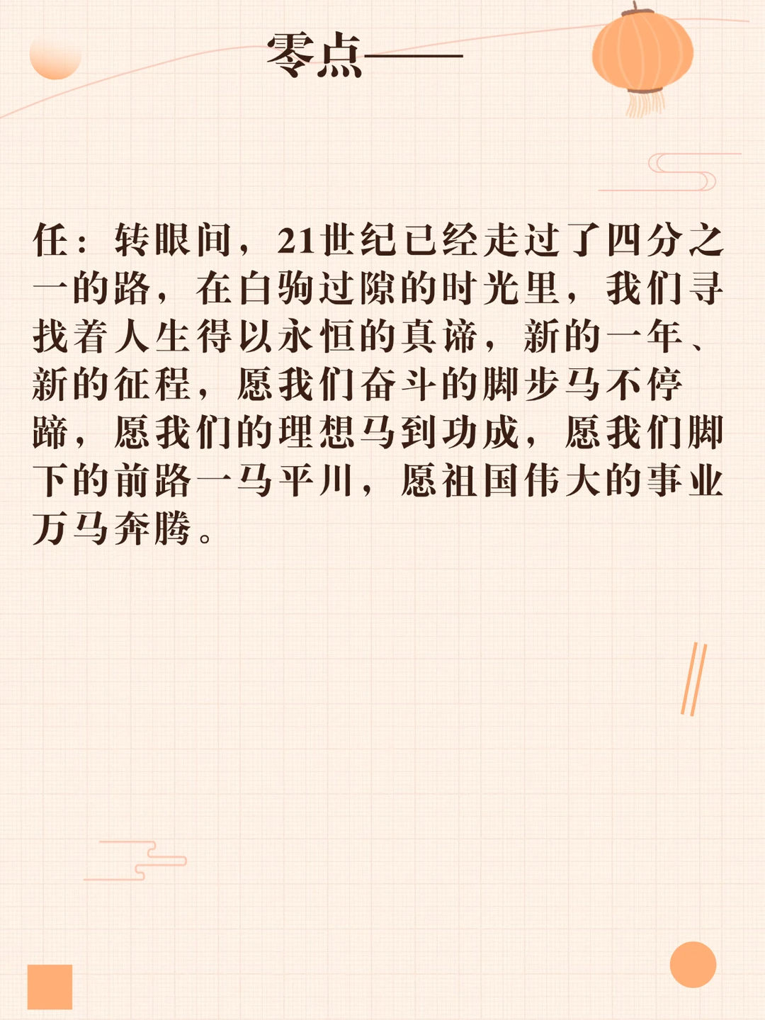 任:转眼间,21世纪已经走过了四分之一的路,在白驹过隙的时光里,我们寻找着人生得以永恒的真谛,新的一年、新的征程,愿我们奋斗的脚步马不停蹄,愿我们的理想马到功成,愿我们脚下的前路一马平川,愿祖国伟大的事业万马奔腾。