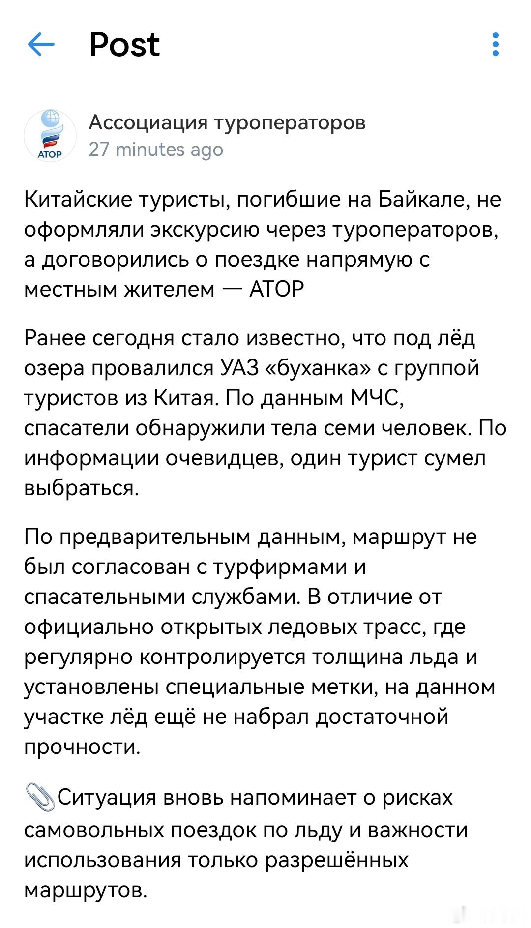 在贝加尔湖遇难的中国游客没有通过旅游运营商安排游览,而是与当地居民联络安排直接出行-ATOR今天早些时候,有消息称,一个载有一群中国游客的UAZ“面包车”在湖面冰层坠入。