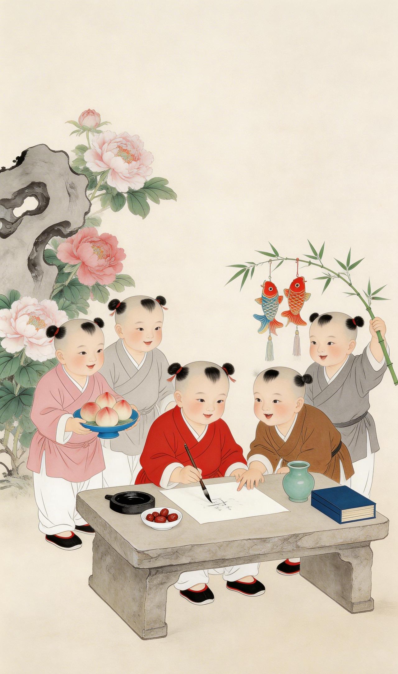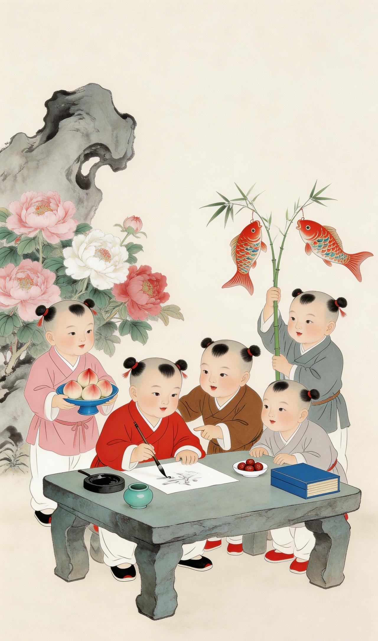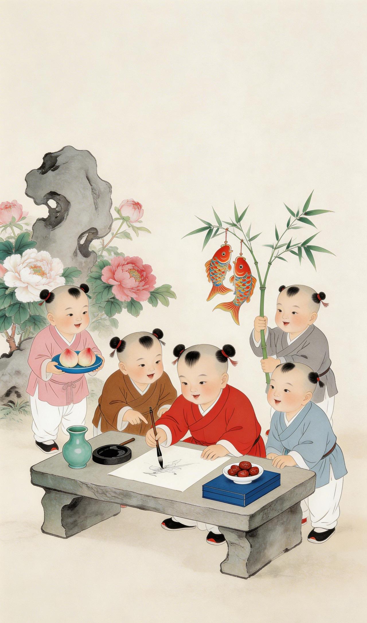 丹青送福,鲤跃童真 ——中国传统年画里的年味 墨香浸润的宣纸上,年味正从笔尖流淌出来。 画面中央,红衣孩童伏在石案前,执笔挥毫,墨迹在宣纸上慢慢晕染,像春雪消融,像福气蔓延。案边,蓝衣与棕衣的伙伴凑过头来,时而指点画中妙处,时而相视一笑——那是只有童年才有的默契与欢欣。 一缕寿桃的清香飘过,粉衣孩童捧着满满的心意,正缓步走来。而最引人注目的,是那位高举青竹的灰衣少年——竹枝轻颤,两条红鲤仿佛在水中摆尾,将“年年有余”的祝愿,随着竹影摇曳送进每个人的心坎。 左侧,粉白牡丹在太湖石旁绽放,雍容华贵;右侧,青翠竹枝亭亭而立,生机盎然。米白色的背景如一张巨大的宣纸,将这吉祥喜庆的画面细细装裱。 五位孩童,五种姿态,却共同诉说着同一个主题:福寿安康。这是中国年画里最朴素的祈愿,也是最深沉的情感。一笔一墨写下的,是对来年的期许;一颦一笑间流淌的,是中华文明千年不绝的温暖与美好。中国传统年画 年年有余
