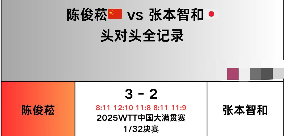 张本智和与陈俊菘的头对头全记录—新加坡大满贯首轮陈俊菘VS张本! 从以往的交手记录来看, 陈俊菘与张本智和在北京 大满贯是首次相遇, 当时陈俊菘以3:2战胜张本智和, 最后一局是11:9两分险胜, 这次新加坡大满贯, 小将陈俊菘能继续击败张本吗? 还能再次打败,证明自己不是偶然 获胜,就像薛飞一样, 继续几次打败张本, 陈俊菘加油, 再赢一场比赛, 打到张本无话说! 拭目以待吧!