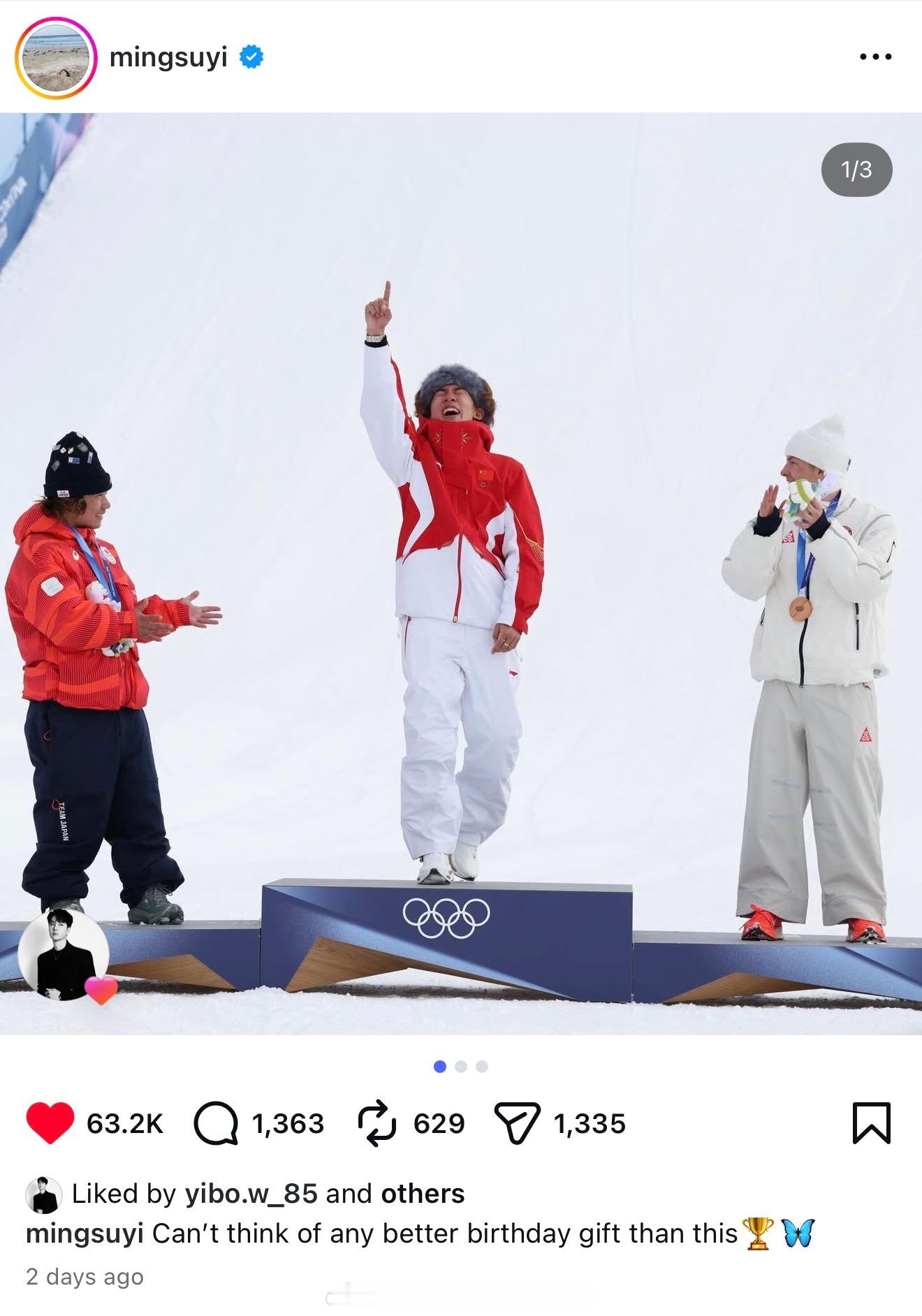 王一博上线ins点赞弟弟的金牌了前几天获得铜牌也是第一时间点赞加油苏翊鸣的第二枚奥运金牌相约下次一起滑雪吧⛷️!💚王一博