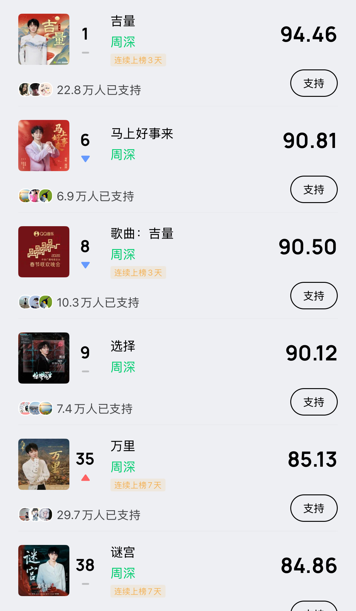 周深 📣 2.20 巅峰潮流 📣米米们大年初四晚上好,每歌做6个动作路径:Q音-乐馆-排行-潮流巅峰