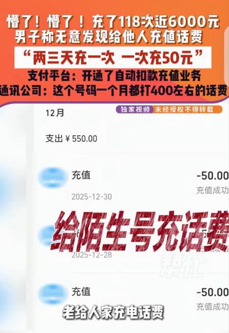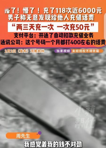 “懵圈了!”2月2日,河南郑州,一男子惊讶发现,他竟然每3天给一个手机号码充50元话费,一共充了118次,共计6000元,而对方是个老太太,一看有人给自己充话费,每月都打400元电话。支付平台:你开通了自动扣款充值业务。男子顿时傻眼了,心疼的直跺脚。   周先生(化名)是郑州本地做建材批发的个体户,平时为了省事开通了不少自动扣款业务,包括话费、会员和各类生活缴费,日常很少逐笔核对小额支出。   直到年底盘账,他才发现每月的支出比预期多出数百元,顺着流水查下去,一个惊人的事实浮出水面:过去 118 天里,他的支付平台每隔两三天就自动扣款 50 元,持续给一个陌生的郑州手机号充值,累计金额已经接近 6000 元。   周先生立刻联系支付平台客服,得到的答复让他瞬间傻眼 —— 系统显示,是他本人在一年前主动为这个陌生号码开通了自动充值业务,设置的规则是余额不足时自动充值 50 元。   客服解释,这类业务一旦开通,除非用户主动关闭或解绑号码,否则会一直执行扣款。周先生这才想起,去年初他帮朋友处理过一次话费充值,可能是当时输入号码时手滑,错把陌生号码填成了目标号码,之后就彻底忘了这件事。   为了弄清对方的身份,周先生又联系了通讯公司。客服查询后告知,这个号码的使用者是一位 68 岁的独居老太太,住在郑州老城区。   老太太的话费账单显示,在周先生的自动充值生效前,她每月话费基本稳定在 100 元左右;而在自动充值开始后,她的月均通话费直接飙升到 400 元上下。   原来,老太太发现自己的话费总是 “用不完”,便开始频繁给外地的子女、老姐妹打电话,有时一聊就是一两个小时,完全没意识到这些话费其实是陌生人在替她买单。   这件事经本地媒体报道后,很快在社交平台引发热议。   有网友调侃:“这大概是最暖心的乌龙事件了,大爷默默给陌生老太充了一年话费,堪称现实版‘匿名天使’。”   也有网友结合自身经历提醒:“我去年也差点因为自动扣款忘了关,损失了几百块会员费,看来以后每个月都得查一遍账单。”   还有理性的网友分析:“自动扣款的便利背后是风险,尤其是涉及手机号、银行卡这类敏感信息,输错一个数字就是大麻烦。”   目前,周先生已经在支付平台关闭了该号码的自动扣款功能,并通过平台发起了异常扣款申诉。不过平台明确表示,由于业务是用户本人开通,且充值金额已经实际到账产生消费,无法直接强制退款,需要周先生与号码使用者协商解决。   老太太得知实情后,最初有些不知所措,在子女的陪同下表示愿意配合,但也提出自己确实已经使用了部分话费,只能退回未消费的余额。   双方经过沟通,初步达成一致:老太太的子女愿意代老人退回 3000 元,剩余部分作为已经产生的通话费用不再追溯。   这起看似荒诞的事件,其实折射出当下数字化支付的普遍隐患。随着自动扣款、免密支付等功能的普及,人们在享受便利的同时,往往忽略了定期核对账单的重要性。   很多人开通自动业务后就彻底遗忘,直到出现大额损失才会察觉。周先生的经历也给所有人提了个醒:无论多忙,每月都要花几分钟检查支付平台的流水账单,及时关闭不需要的自动扣款业务;在输入手机号、银行卡号等关键信息时,务必反复核对,避免因一时疏忽造成长期损失。   你有没有遇到过类似的自动扣款乌龙?平时又是怎么管理自己的支付账单的?欢迎在评论区分享你的经验和看法,一起聊聊如何避开支付里的那些坑。