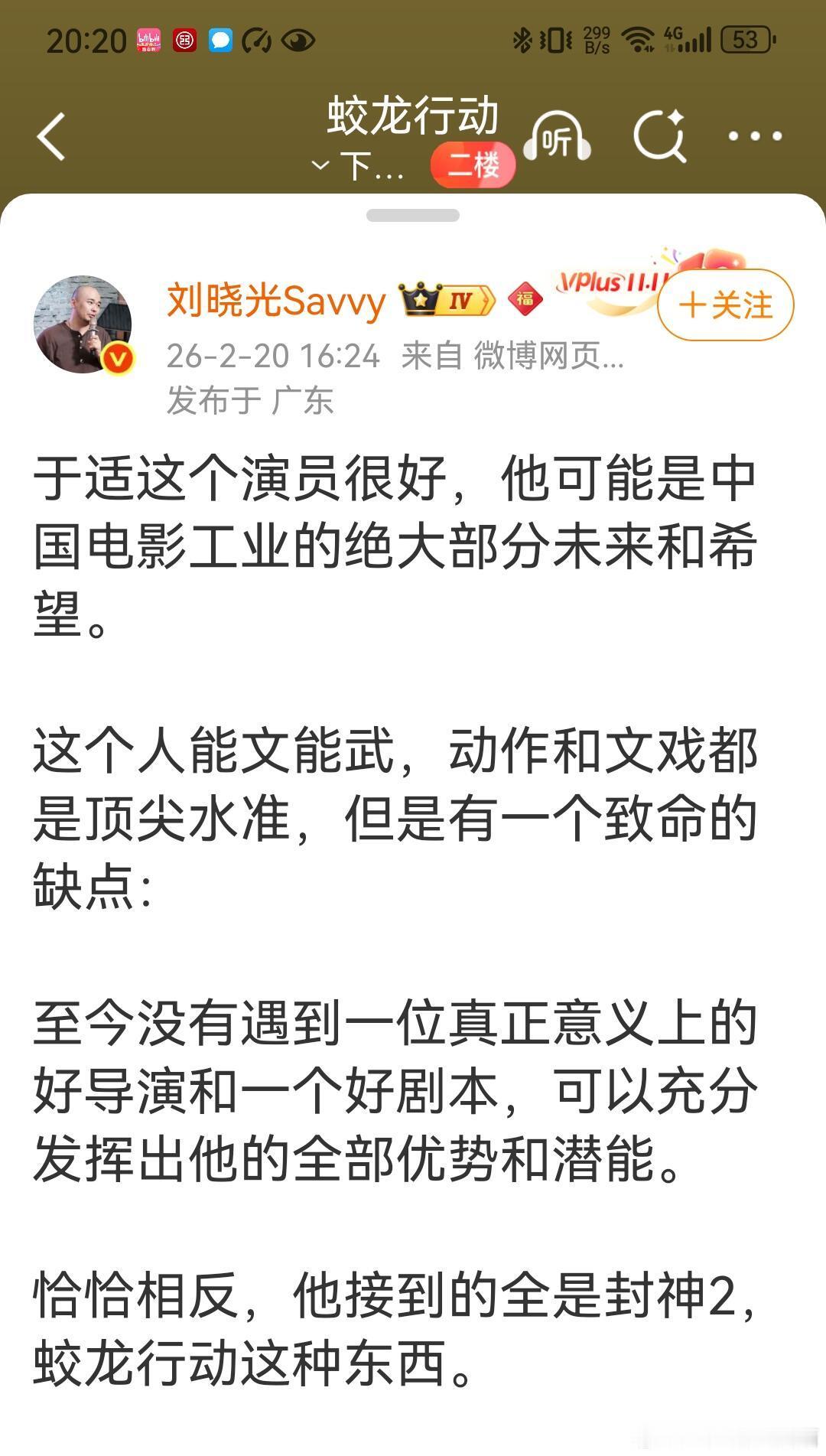 于适是非常优秀的演员,能文能武,如果有机会遇到真正能发挥他优势的电影和剧本,他是能成为吴京沈腾那样的演员