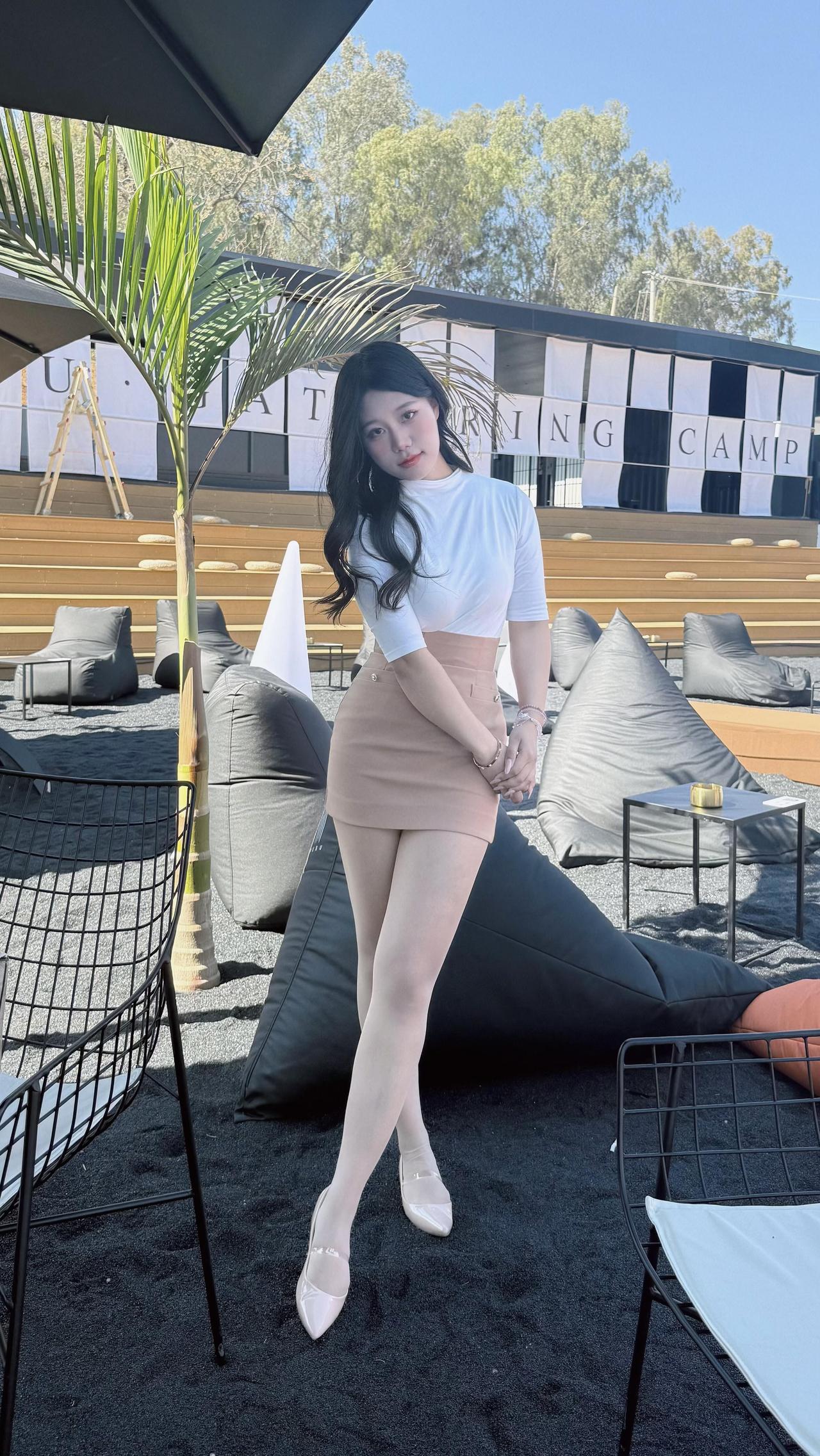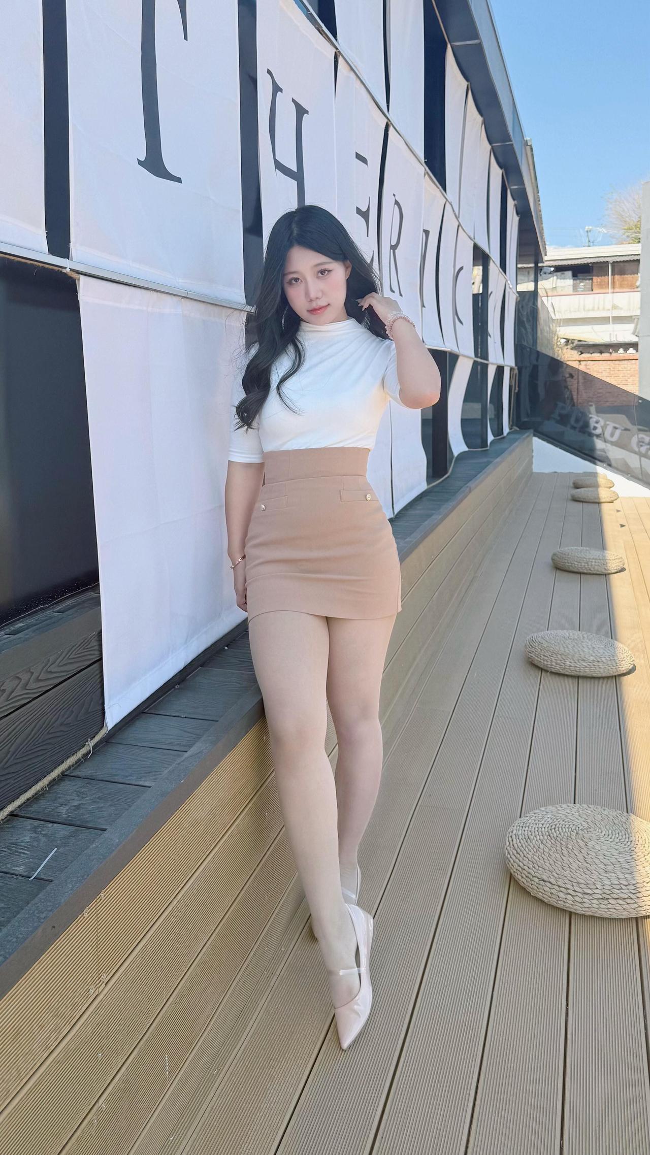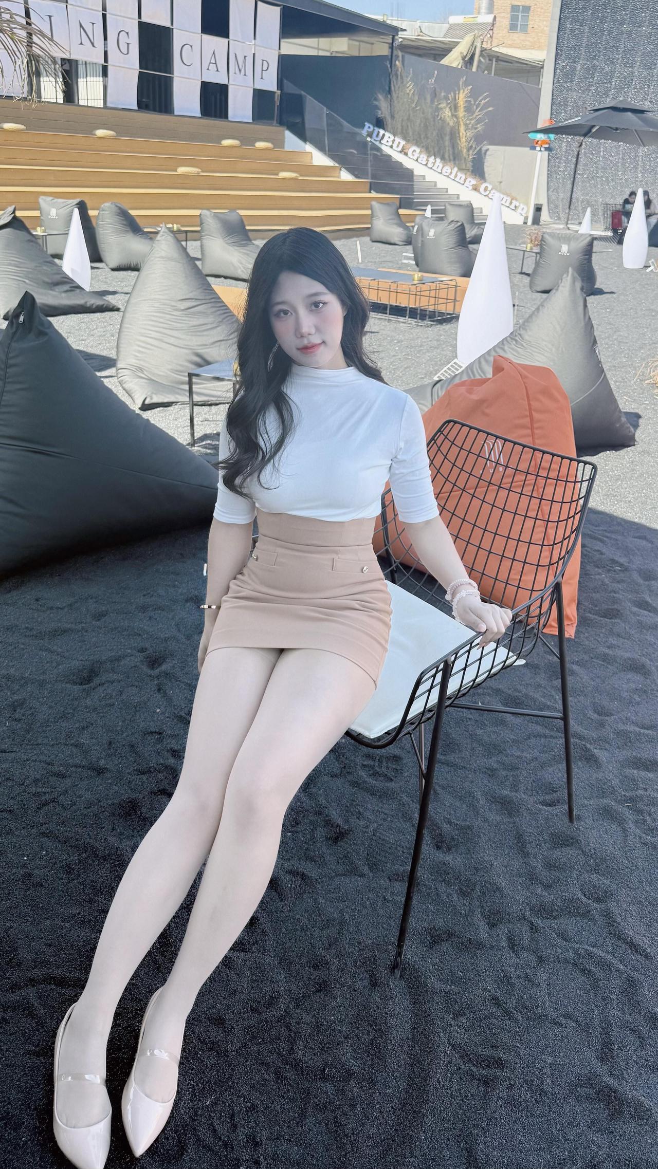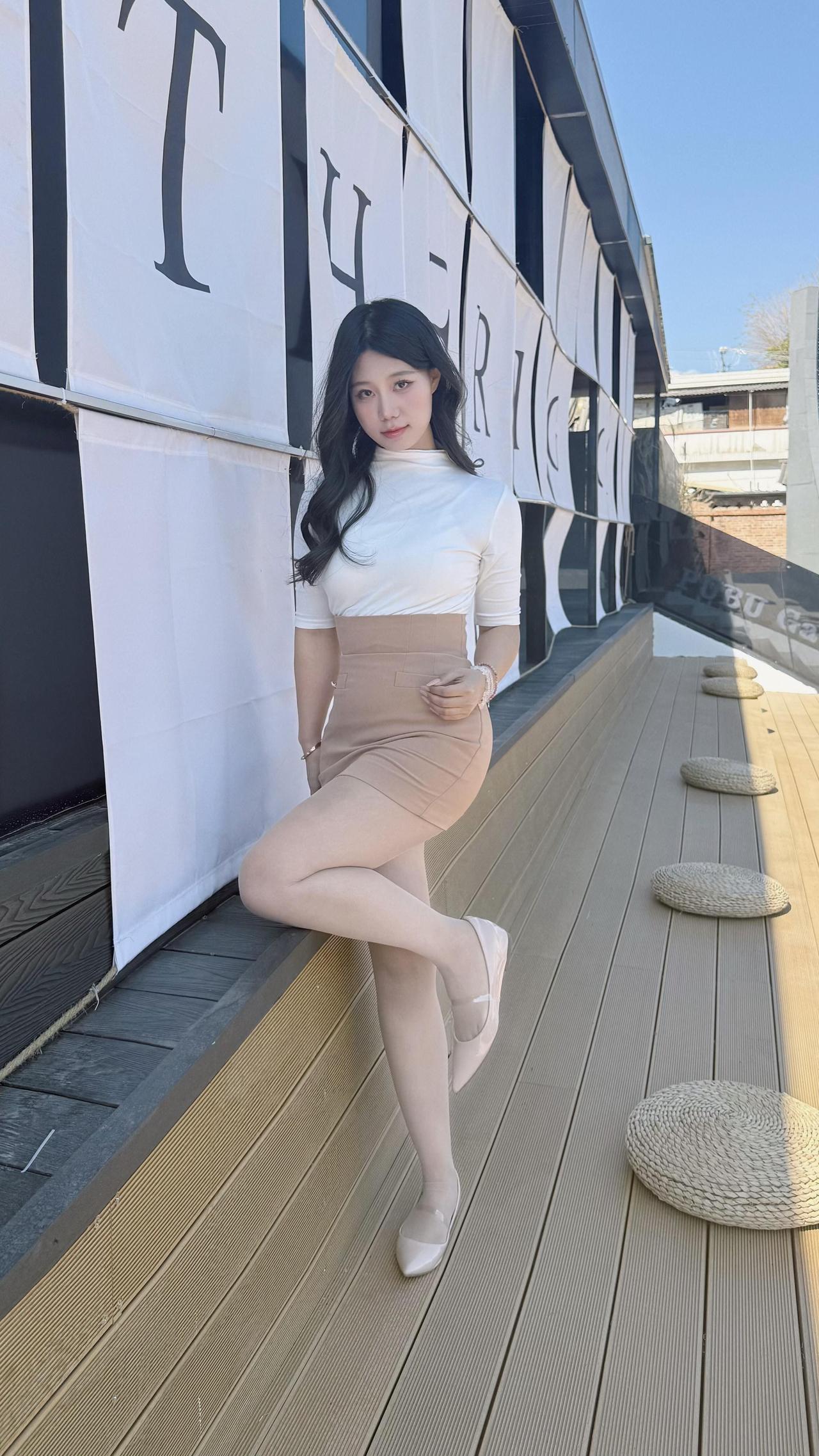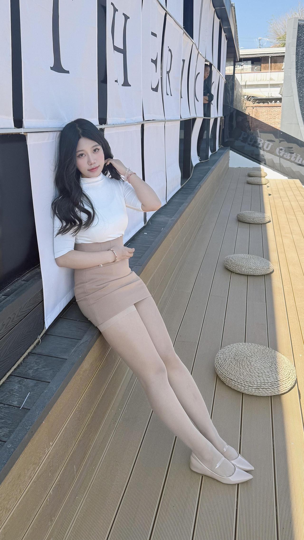《露台春行》 露台木栈映春光,佳人闲步意悠扬。 白衣高领显清雅,卡其短裙衬身长。 丝袜轻裹肌肤隐,尖头平底步生香。 或坐或倚姿态美,长发随风舞霓裳。 背景建筑现代风,字母横幅显时尚。 豆袋散落休闲地,棕榈摇曳添热带。 蓝天澄澈阳光暖,户外营地氛围佳。 此景此情难自禁,诗心涌动赋华章。