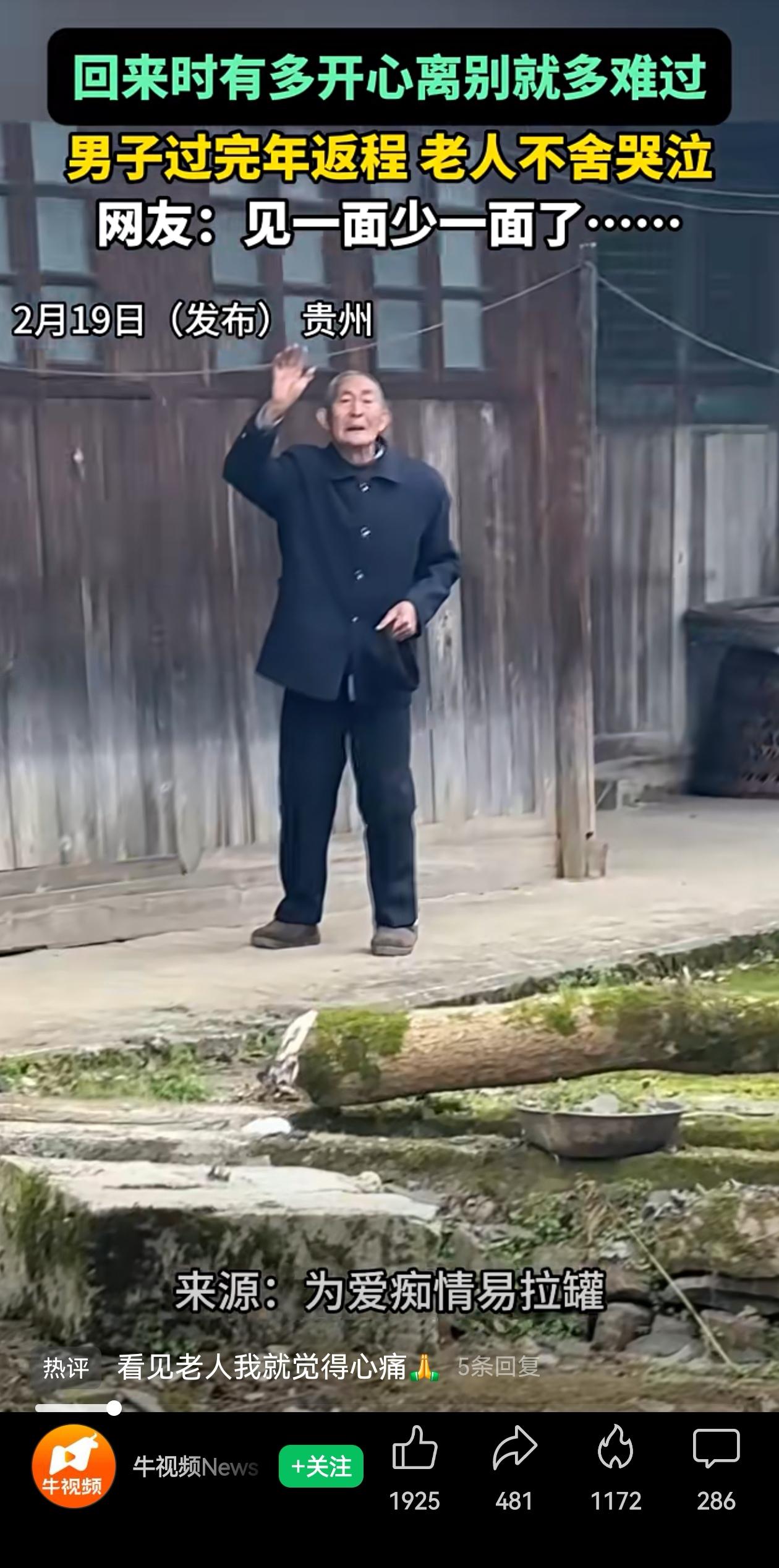 心疼老父亲啊!转眼间,假期要到了。儿子要返程了,刚准备走,老父亲绷不住了,当场哭了出来。没有大吵大闹,就是憋了好几天的那股舍不得,临到门口实在压不住了。 一边是老父亲的眼泪,一边是不得不走的生活。儿子想留下来,可工作在外面,挣钱在外面,未来的日子也在外面。 不得不走,但是看着老父亲依依不舍挥手,确实心疼啊! 网友说得太对了:“回来的时候有多高兴,走的时候就有多心酸。”过年那几天,家里热热闹闹的,老人笑得合不拢嘴,觉得圆满了! 但是假期毕竟有限,儿子不得不走,屋子空了,老父亲的心也跟着空了。 最怕那句“见一面少一面”。平时忙着讨生活,不敢细想,可一到离别,这句话就直往心口撞。 老人的眼泪里,藏着“不知道还能送几回”的担心?没人说破,但谁都明白。 看不得这种画面,是真的看不得。 但是手里搬着砖,就抱不了家人;放下了砖,又养不起家。 只愿家里老人健健康康,下次团圆,早点回来。 信来来源:牛视频News