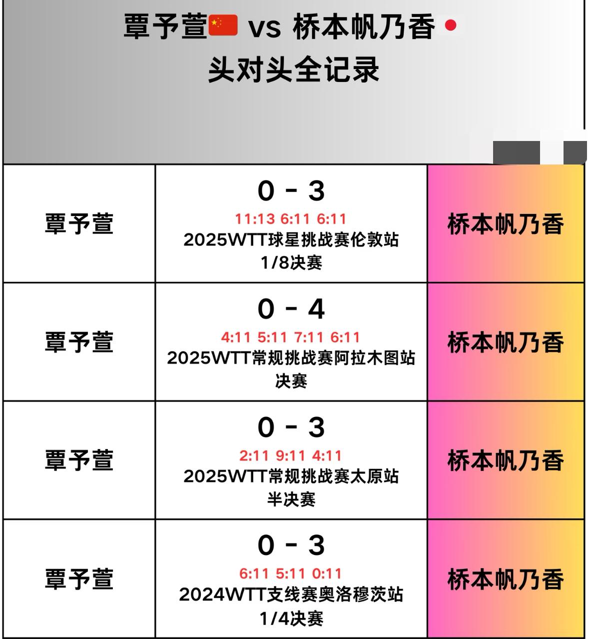 覃予宣与桥本帆乃香的头对头全记录 2026新加坡大满贯, 女单首轮1/32决赛, 覃予宣VS桥本帆乃香, 小蘑菇是外卡选手, 首轮打桥本, 签太背啦, 从以往的交手记录来看, 覃予宣对桥本保持 四战皆负的不好局面, 全部被桥本零封, 小蘑菇的运气真的超级不好, 但这次争取赢两局吧, 覃予宣还年轻, 可以多历练, 涨经验,也是一种收获!