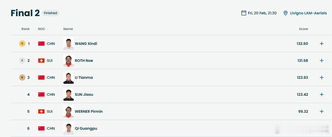 中国选手李天马123.93分获得季军,孙佳旭123.42分获得第四名。齐广璞获得第六名。