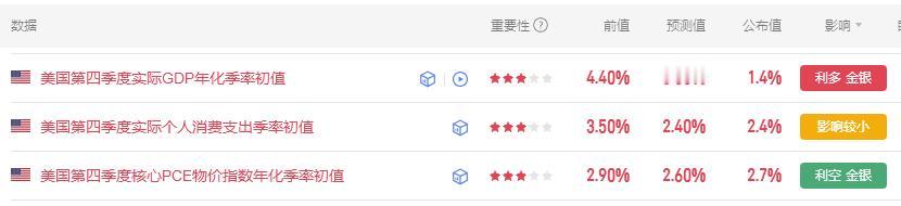今晚美国第四季度的多项数据公布。 首先美国第四季度实际GDP年化季率初值 公布为 1.4%,市场预期3.00%,前期数值4.40%。 其次美国第四季度核心PCE物价指数 年化季率初值 2.7%,市场预期2.60%,前值2.90%。 最后美国第四季度实际个人消费支出季率初值 2.4%, 市场预期2.40%,前期数值3.50%。 这三项数据,基本上都是利多金价的, 数据公布以后,金价走强几美元。