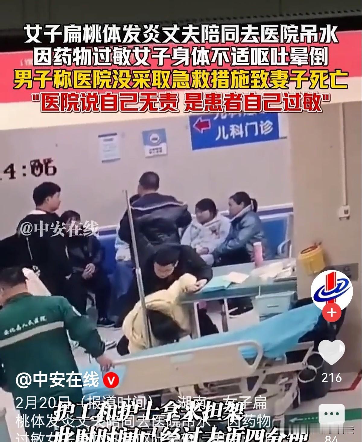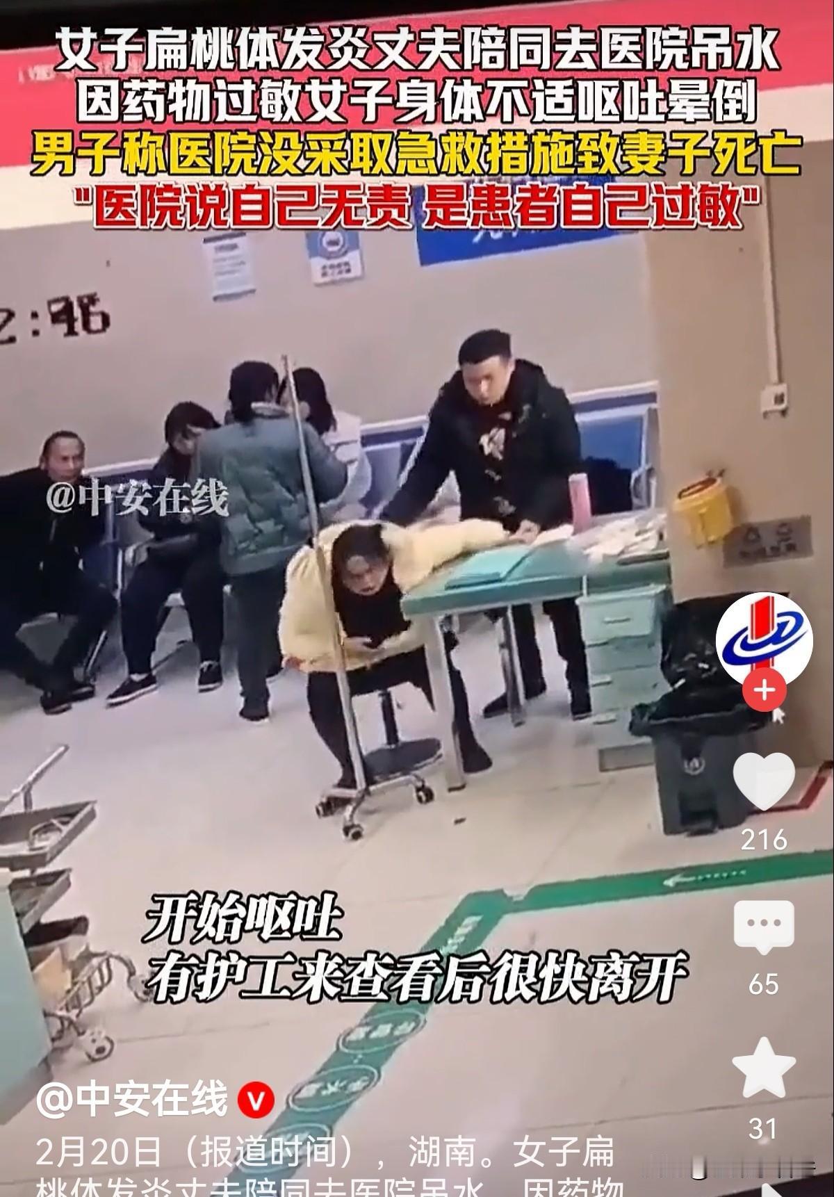 湖南益阳,女子扁桃体发炎,丈夫陪同去医院吊水,仅打了4秒钟,女子开始有呕吐、胸闷的症状,有护士来查看很快离开。丈夫大喊护士过来帮忙,这才推开担架,然而,女子抢救无效死亡。丈夫认为错过黄金救援4分钟,医院未采取急救措施存在责任,而医院说说自己无责,是女子自己过敏,不让见尸体,要求签11万人道主义赔偿! 一位丈夫,至今都活在无尽的悔恨与愤怒里。 他怎么也想不通,只是一场普通的扁桃体发炎,妻子好好地走进医院,却在输液短短几分钟后,永远地离开了他。 事发当天,妻子因扁桃体发炎有些难受,夫妻俩想着来医院挂点水消消炎,很快就能好。 妻子状态一直很平稳,还和他有说有笑,看着护士准备针头、配药,整个人精神头十足,完全不像重病之人。 谁也没料到,这一次普通的就诊,会变成生离死别。 护士准备给妻子输头孢曲松,全程没询问过敏史,更没做皮试,直接就扎针输液。 药液刚进入体内4秒钟,妻子脸色骤变,开始有呕吐、胸闷的症状。 她猛地拉开外套拉链,大口喘着气说胸闷。紧接着头晕袭来,她下意识用手托住额头,身体开始不受控制地发软。 丈夫瞬间慌了神,一眼就看出妻子不对劲,立刻大声呼喊护士。 护士赶来后,只是简单拔掉了输液针,没做任何急救处理,甚至没意识到情况有多危急,看了一眼就转身离开。 妻子的痛苦在不断加剧,恶心、呕吐接踵而至,她难受得蜷缩起来。旁边路过的护工只是瞥了一眼,也漠然走开。 丈夫抱着痛苦挣扎的妻子,心脏像被狠狠揪住,他一遍遍地嘶吼求救,可医护人员始终没出现。 过敏性休克的黄金4分钟,就这样一分一秒流逝。 这是救命的关键时间,只要及时注射肾上腺素、开展急救,大概率能挽回生命。 可在妻子最需要救治的时候,身边只有焦急无助的丈夫,和一群视而不见的医护人员。 直到近4分钟后,才有护工推着仪器、护士抬着担架慢悠悠赶来。 此时妻子已彻底休克,失去了意识。 丈夫眼睁睁看着妻子从精神饱满,到胸闷呕吐,再到彻底晕倒,全程被绝望包裹。 他拼命呼喊妻子的名字,却再也得不到回应。 最终,妻子因严重药物过敏抢救无效离世。一个鲜活的生命,因为一场小病、一次违规操作、一场延误抢救,永远定格在了医院的输液室里。 悲剧发生后,医院的态度更让丈夫寒心。 院方坚称自己无任何责任,把所有过错推给患者自身过敏,甚至拒绝家属查看遗体,还不断施压,要求丈夫签署协议,接受11万元人道主义赔偿就此了事。 丈夫彻底崩溃了!妻子的命,难道就值11万吗?他亲眼目睹了整个过程:护士未问过敏史、未做皮试就用药;过敏发生后,黄金抢救时间内无人施救。 出了人命,医院只会推卸责任。这每一步,都是导致妻子死亡的推手。 从医疗规范来看,即便头孢曲松不强制常规皮试,医务人员也必须详细询问过敏史,这是最基本的诊疗流程。 《民法典》第1221条明确规定,医务人员未尽到相应诊疗义务造成患者损害,医疗机构应当承担赔偿责任。 用药前不核查过敏史,是流程失职;过敏后不及时急救,是责任缺失。 这两条过错,任何一条都足以认定医院存在重大过失,绝非一句“患者自身过敏”就能撇清关系。 好好的一个人,笑着走进医院,却再也没能走出来。 对于这个家庭来说,失去的是妻子、是母亲、是至亲之人,不是11万能抹平的伤痛。 医 院本该是守护生命的地方,却因为失职,变成了夺走生命的伤心地。 如今,丈夫只想要一个公道,想要医院正视自己的过错,给逝去的妻子一个交代。 有人说,人命关天了,还慢腾腾的,应该负全责! 对此您觉得谁的责任更大?