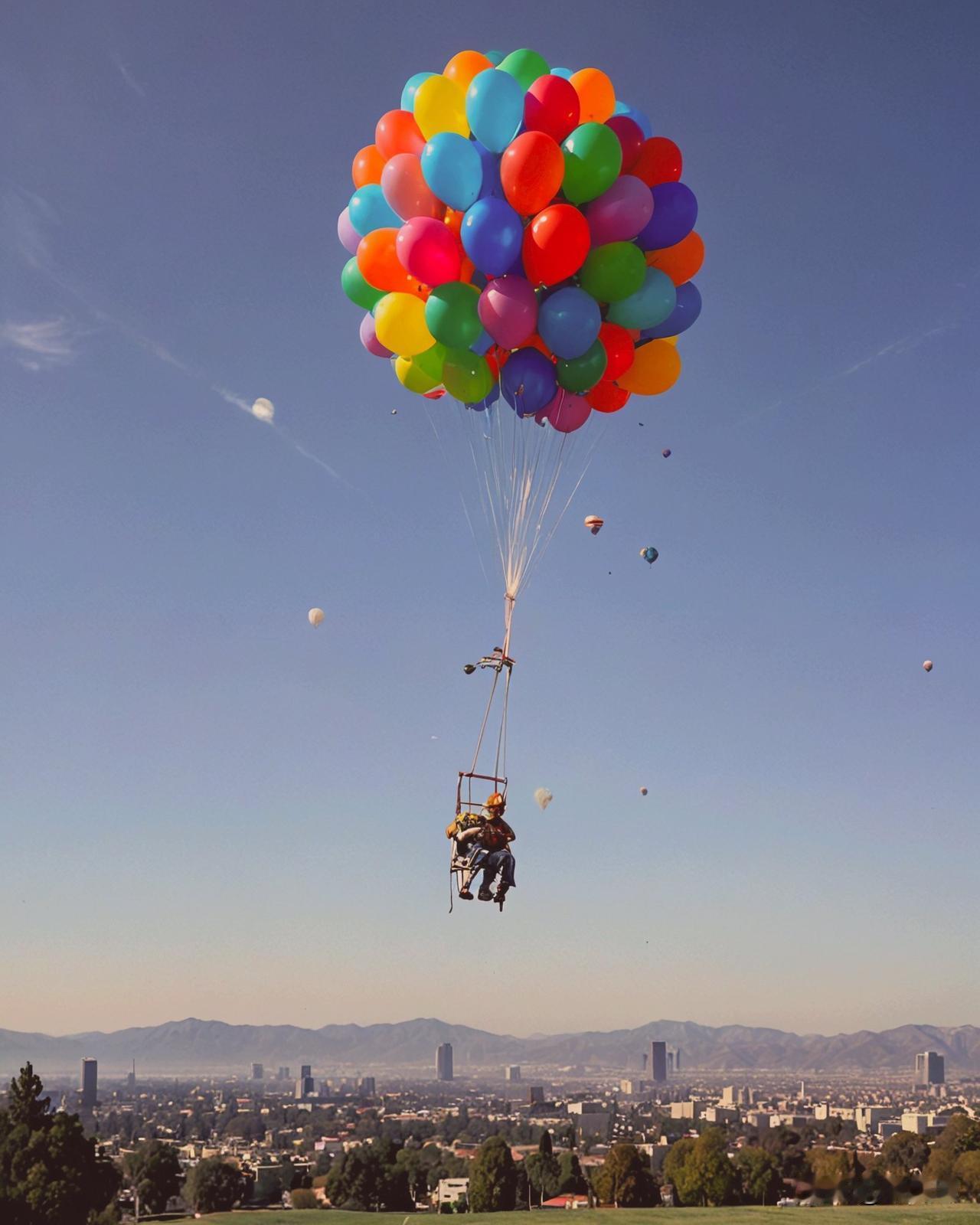 这几张照片展示的是著名的“草坪椅拉里”(Lawnchair Larry),原名拉里·沃尔特斯(Larry Walters)。 1982年7月2日,这位来自洛杉矶的卡车司机为了实现飞行梦想,在自己的折叠草坪椅上绑了 42到45个 充满氦气的气象气球。 沃尔特斯原本计划只在离地几十英尺的高度漂浮,但由于固定绳索意外断裂,他迅速升到了约 16,000英尺(约4,900米)的高空。 他随身携带了气枪、CB无线电、三明治、啤酒和作为压舱水的水壶。为了降落,他使用气枪射破了几个气球。 结局: 他的椅子最终挂在了长滩的输电线上,所幸本人并未受伤。 降落后他立即被警方逮捕,并因违反联邦航空条例被联邦航空管理局(FAA)处以罚款。 名言: 当被记者问及为何这样做时,他留下了著名的回答:“人不能只是坐在那儿。”(A man can't just sit around.) 目前,他当时使用的那把椅子已被史密森尼国家航空航天博物馆收藏。