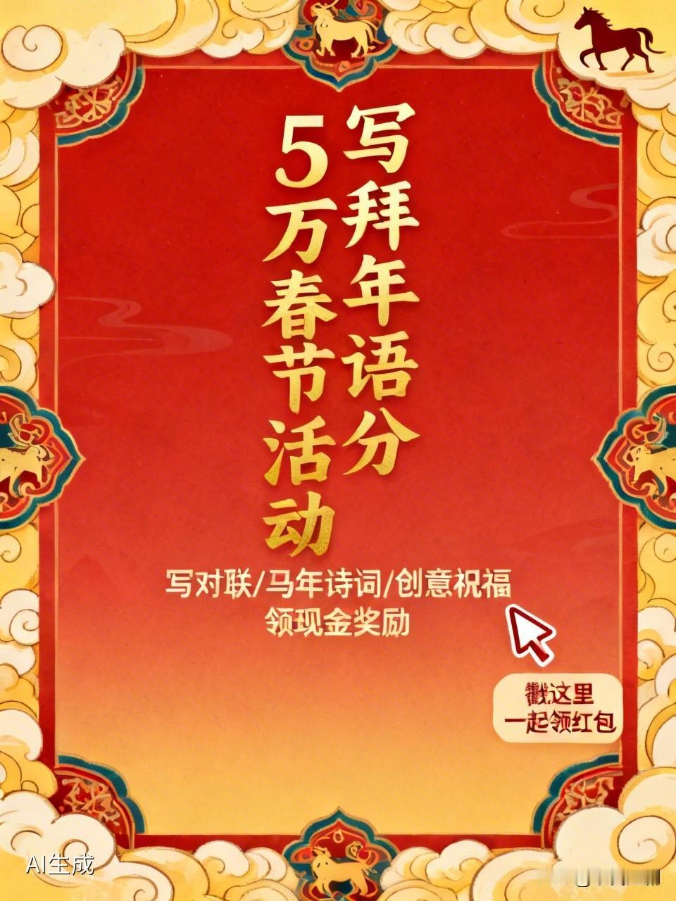 家人们,我正在参加一个超棒的写拜年语分5万的春节活动!只要写对联、马年诗词或者创意祝福,就有机会拿到现金奖励。 这活动太适合咱们这些喜欢舞文弄墨的人了。对联能展现咱的文学功底,马年诗词可以抒发对新一年的期待,创意祝福更是能把满满的心意传递出去。 我已经写了好几条拜年语,就等着瓜分现金啦。大家也别错过,赶紧戳链接参加,一起领红包,让这个春节更有年味!