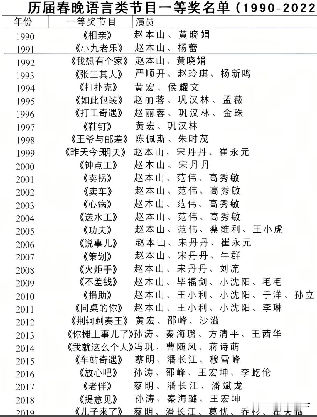 历年春晚小品节目一等奖名单