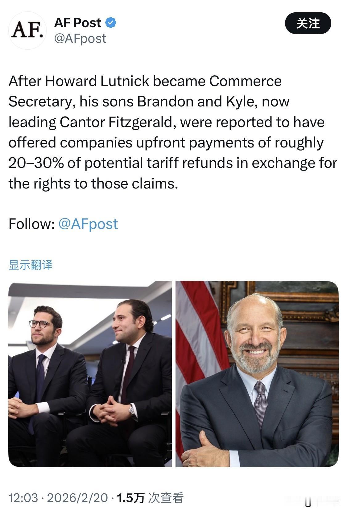 最高法院刚刚裁定特朗普的关税政策非法。猜猜谁会因此大赚一笔? 坎托·菲茨杰拉德公司(Cantor Fitzgerald)目前由商务部长霍华德·卢特尼克(Howard Lutnick)的儿子们经营,该公司一直在以极低的价格从美国进口商那里购买关税退税权。 该方案的运作方式如下: →美国公司支付了数十亿美元的关税,而这些关税现在被裁定为非法。 →坎托尔找到这些公司说:“现在,我给你们每应得的1美元退款,就给你们25美分。” →公司宁愿快速套现,也不愿等待数年走完法律程序。 →退款到账后,坎托尔会收到全额退款。 卢特尼克通过将坎托公司的股份转让给他二十多岁的儿子们,并将自己的股权放入一个信托基金,从而“剥离”了这些股份。他为此次转让支付了零资本利得税。 作为商务部长,卢特尼克对政府的法律策略了如指掌,包括律师如何评估胜算以及他们将提出的论点。而他家族的律师事务所却押注于反对他老板一手制定的关税政策。 他们以每美元 25 美分的价格买入,而根据今天的最高法院裁决,这些权利可能价值 80 至 90 美分。 潜在的收益可能高达数十亿美元。这属于内幕交易,只不过手法更加复杂。