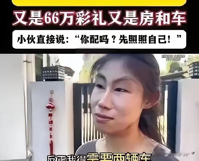俗话说,人有多大胆,地就有多高产。 搬到相亲市场上,就是脸皮有多厚,彩礼就要多高。 一个相貌平平,甚至有点丑陋的女子,在相亲市场上就敢狮子大开口,对前来相亲的男子开口就要房要车,还要66万的彩礼。 男子说,你配吗?也不照照自己。 女子待价而沽本没错,可也不能空想着能死猫就一定能碰上瞎老鼠。