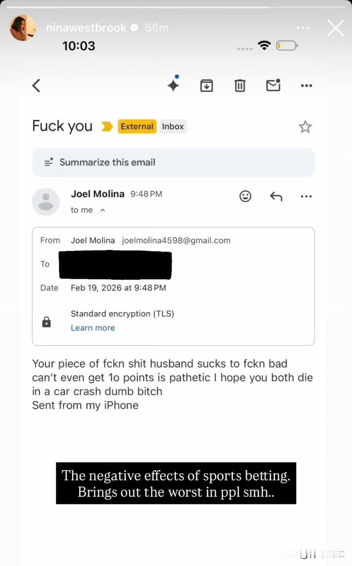 过分!威少妻子遭遇死亡诅咒! 今天,威少妻子Nina在社交媒体发布了动态,晒出了一张照片,上面的内容是自己收到的死亡诅咒的邮件:你那狗屁丈夫烂透了,连10分都得不到,太悲哀了,祝你们两个一起出车祸。 威少昨天的表现可能是导致这位球迷发出诅咒的原因,在昨天对阵魔术队的比赛中,威少8投2中仅得到5分1助攻1抢断,国王队惨负对手遭遇15连败。这位球迷极有可能是在体育博彩上输了不少钱,才会情绪失控说出这样的话。威少妻子如此回应道:这就是博彩带来的负面影响,他激发了人性中最丑陋的一面,让人无可奈何。这说的一点没错!