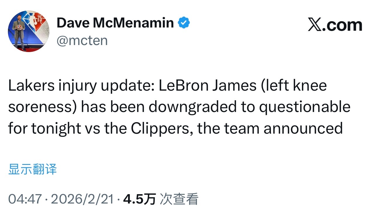 詹姆斯左膝酸痛,今天对阵快船出战成疑。
