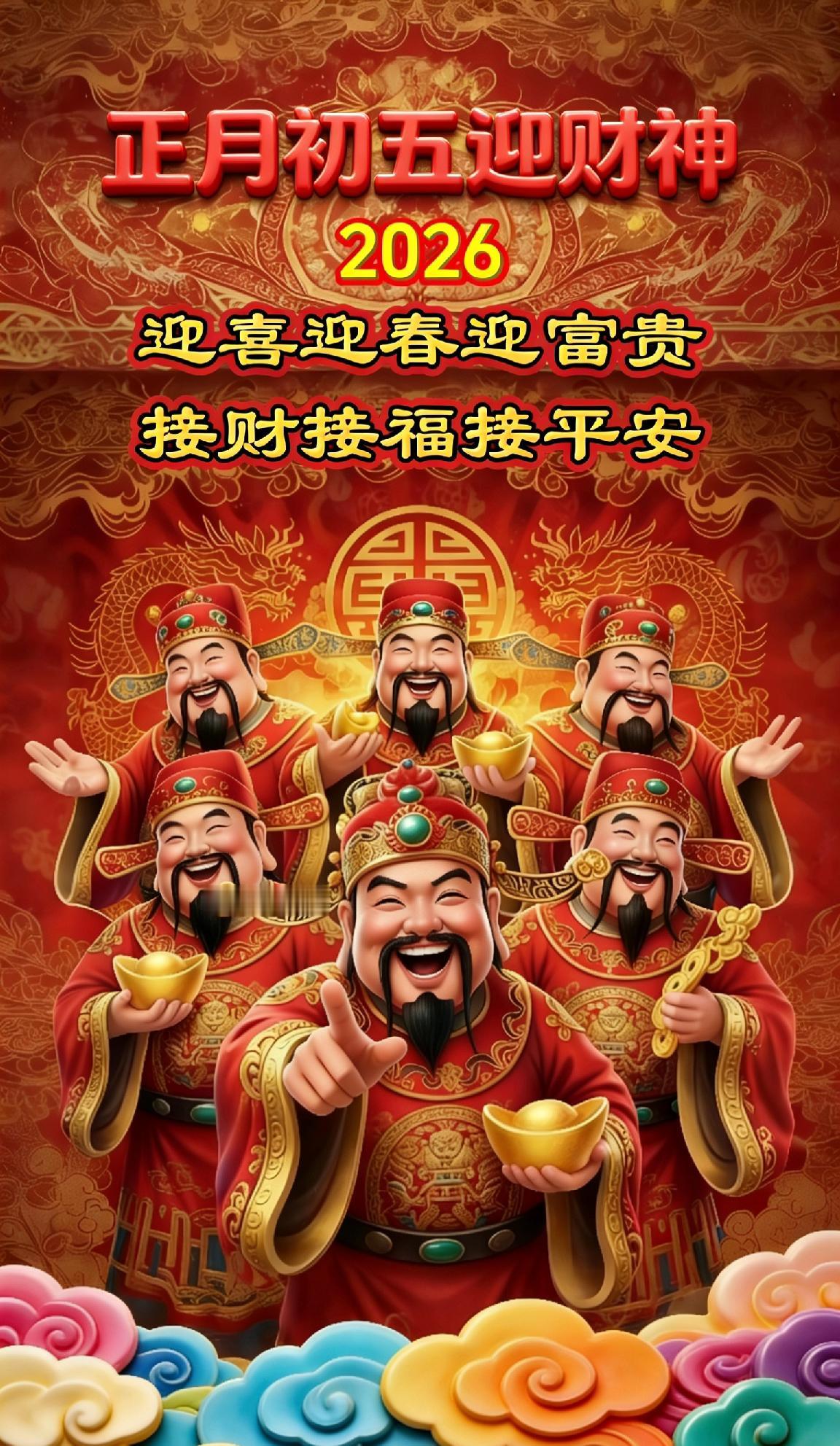 初五破五,送穷迎富!送走穷神,迎来财神。马年行大运,金银满屋堆。这一拜,祝大家日进斗金;这一接,愿各位富贵安康!正月初五 迎财神习俗