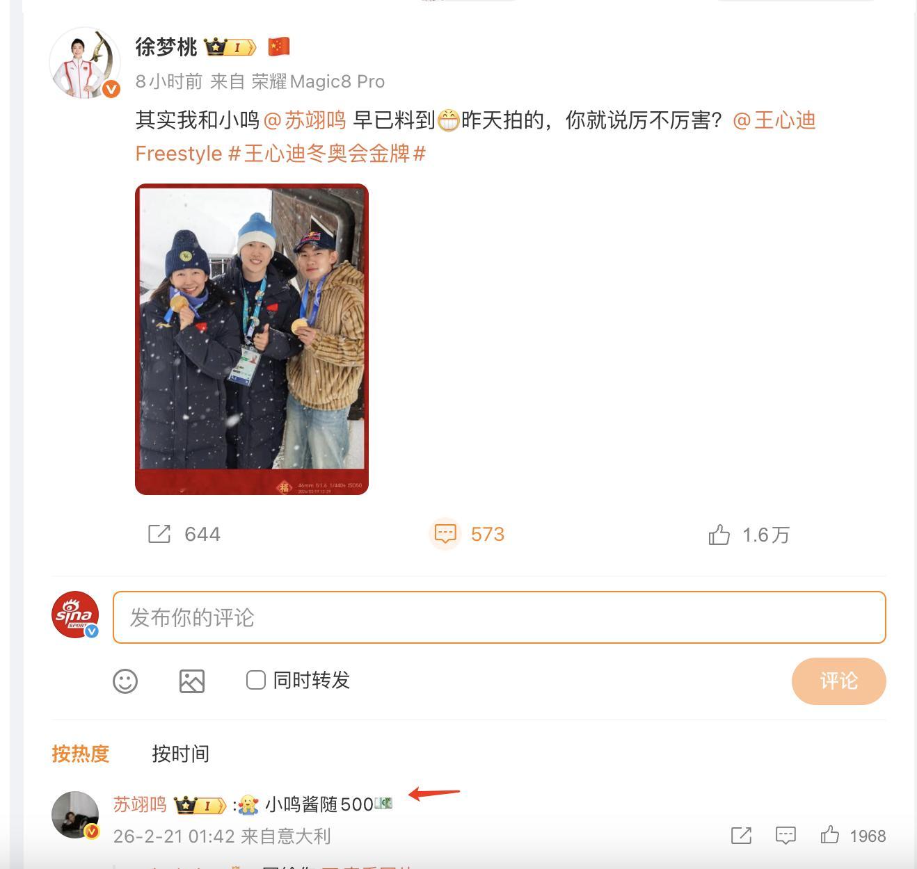 苏翊鸣回复:“小鸣酱随500!”(吾腹腹)