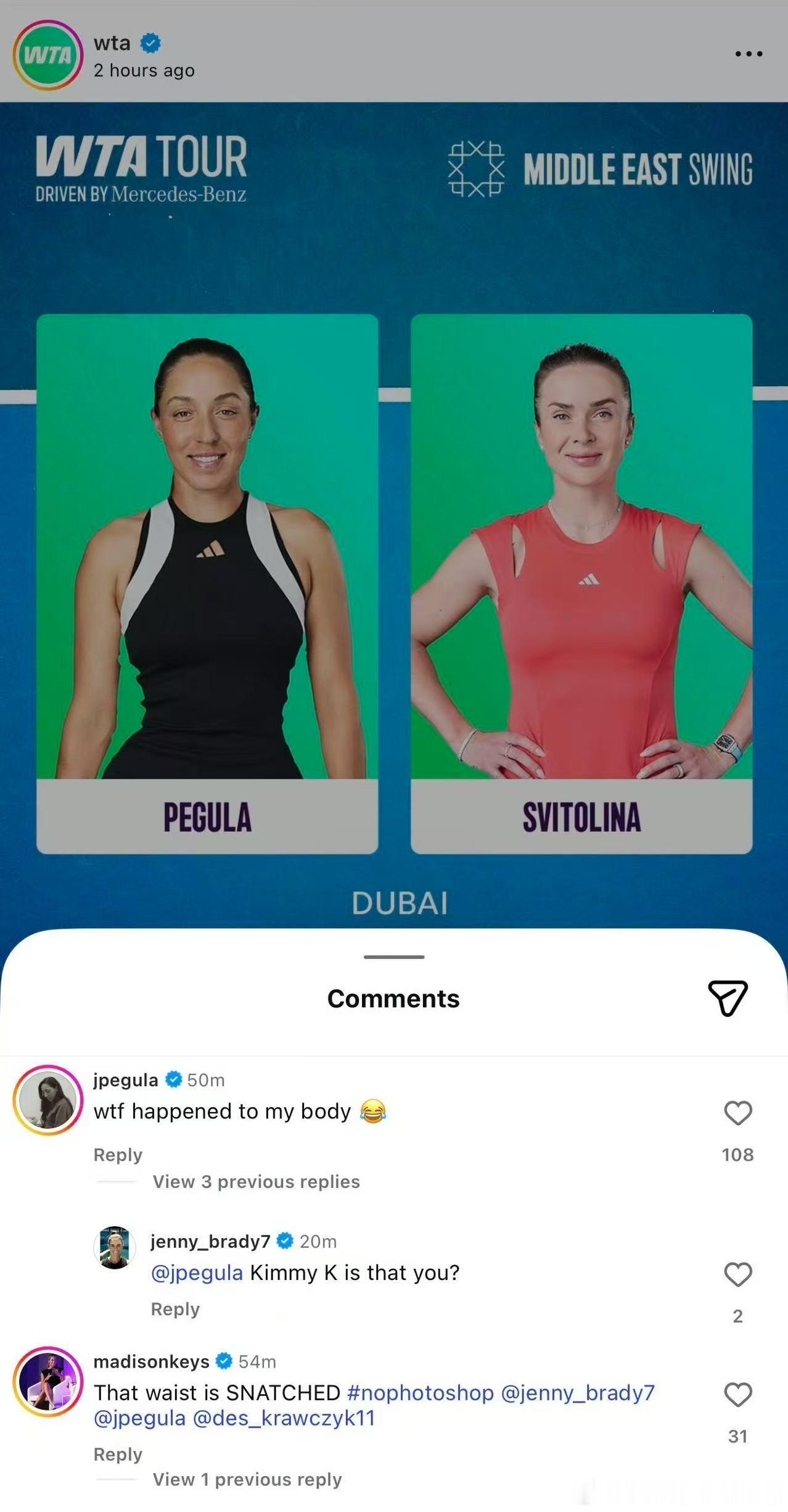 哈哈哈哈哈哈,一早被笑s佩古拉,打进迪拜1000赛决赛后这张决赛前瞻照片,被WTA修图的师傅给“曼妙的身姿”了……腰也过于细了……造成这“笑果”的原因是这套衣服腰这块是白色的,修图的就把白色这块给抠了啊……JPEG自己都下场回复了WTF我的身体怎么会这样布雷迪回复JPEG“你这是金·卡戴珊吗?”wta