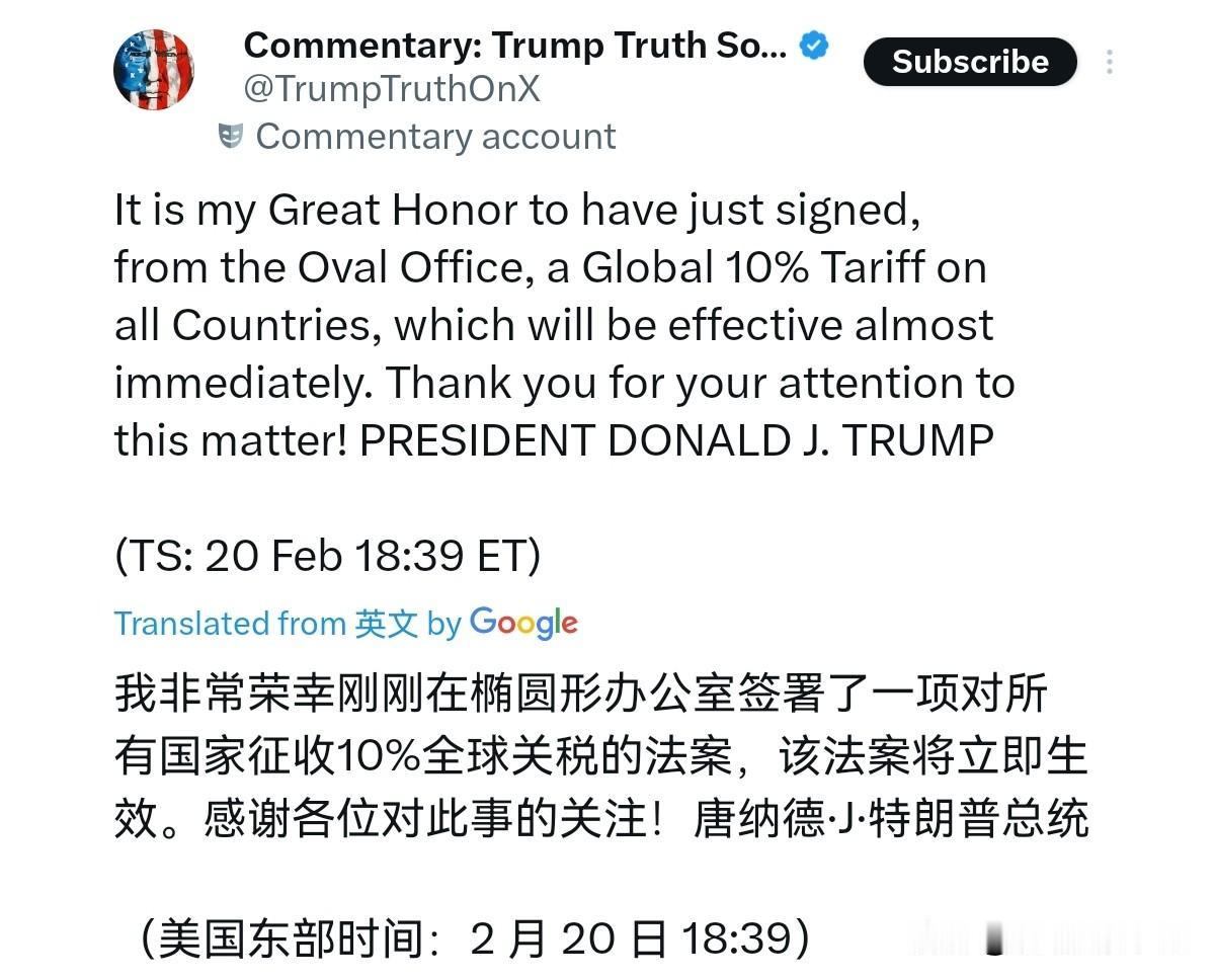 美国的一巴掌,扇晕了刚刚与美国达成协议的高市早苗!2月21日,特朗普声称,我非常荣幸地刚刚在椭圆形办公室签署了一项对所有国家征收10%全球关税的法案,该法案几乎将立即生效。感谢您对此事的关注!很显然,特朗普的这一宣布,说明什么呢?这充分说明一点,单方面对美国妥协,对美国大让步换取的协议,美国说废弃就废弃。 美日协议达成,高市早苗声称日美同盟是“最优先事项”,高调感谢特朗普支持其大选,称要共创“日美同盟新黄金时代”,承诺严格落实5500亿美元对美投资、开放农产品市场,结果呢?美国反手就加税10%,这样的尴尬局面,对于高市早苗本人无异于羞辱。 面对美国的重压,日本不敢反抗,只得单方面让步,现在美国加税10%,难道日本就敢反抗吗?美国此举充分说明,在特朗普心里面,日本根本不是处于平等地位的盟友,而是一个任凭美国意志支配的对象,而根本无需考虑日本的感受。高市早苗本以为,送上巨额投资、开放市场、紧跟美国外交路线,就能换来换来美国的特殊对待,绑紧美国。 但是在美国的利益算盘里,日本的牺牲、日本的诉求、日本的脸面,统统都可以忽略不计。前脚刚把你捧成“亲密盟友”,后脚就把你和其他国家一起列入加税名单,一点缓冲、一点通知、一点情面都不留。当然,特朗普的新税会不会执行,这是一个问题,但是以美国的做派,恐怕又要让日本付出更多的利益代价,才肯罢手。