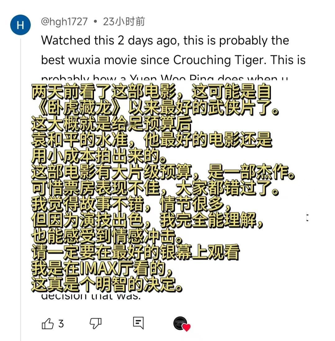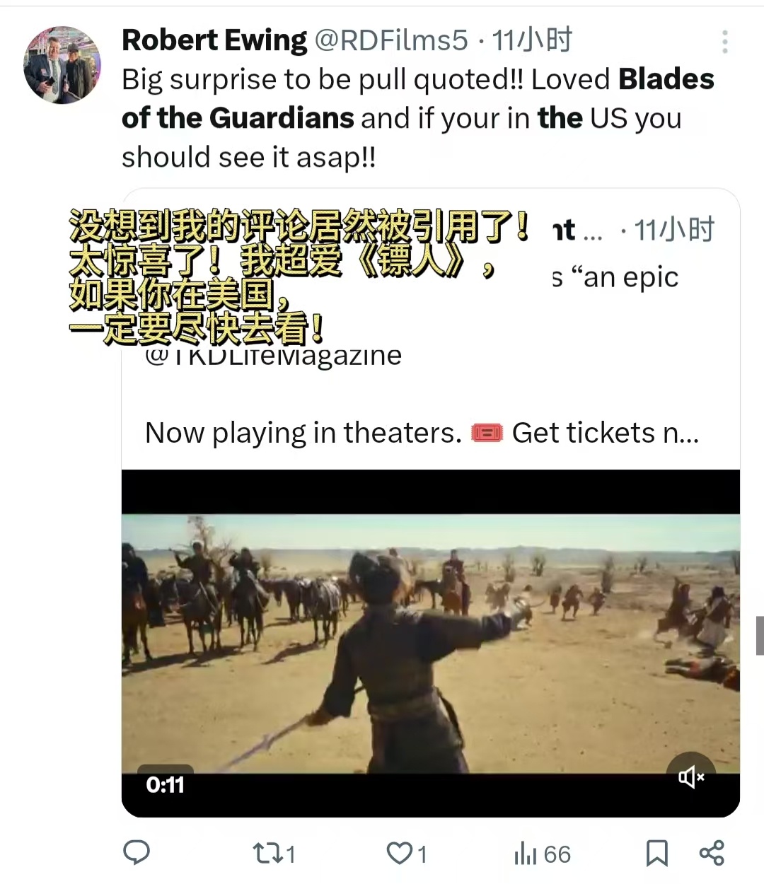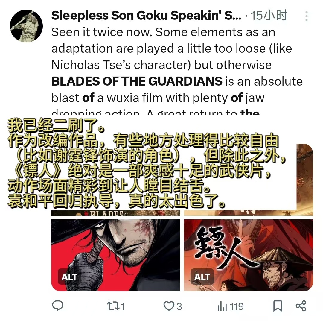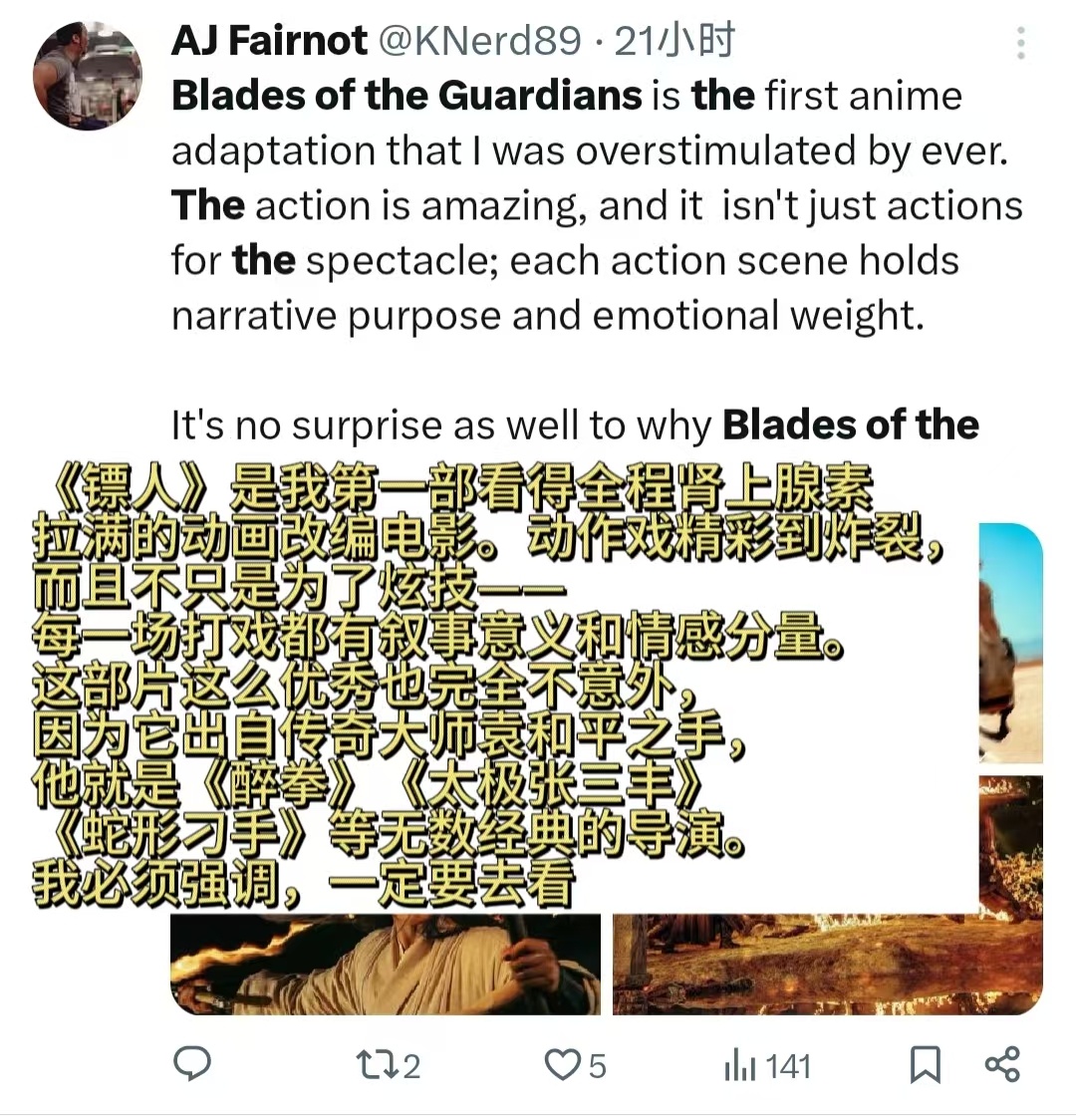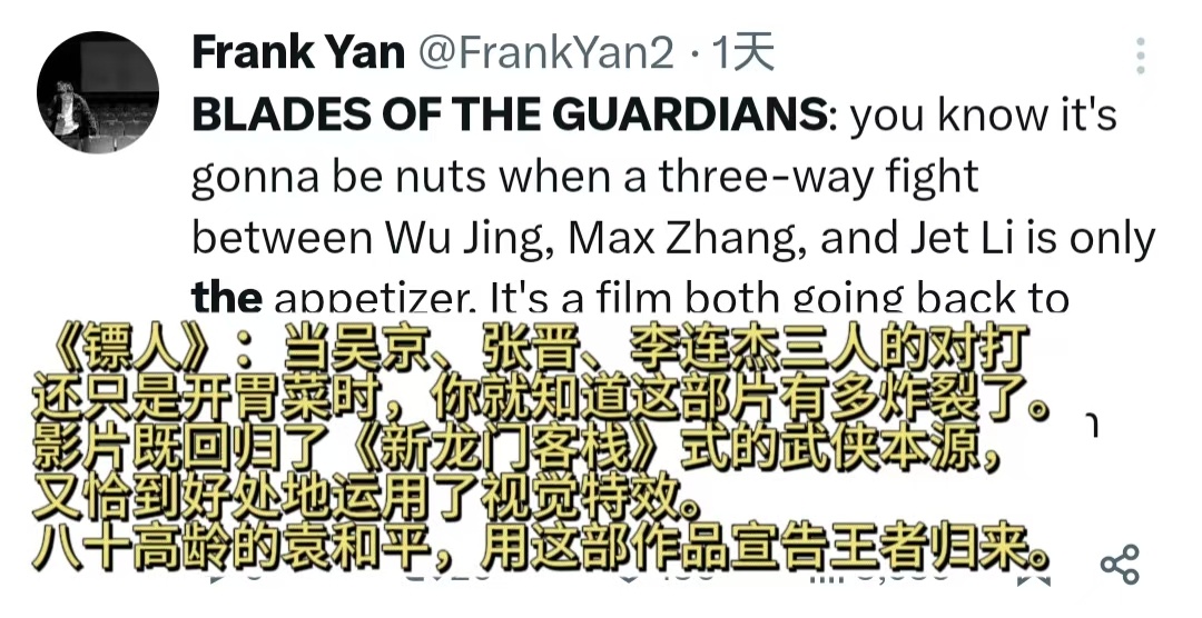镖人海外评价镖人海外口碑 “《镖人》是我第一部看得肾上腺素拉满的动画改编电影”“这可能是自《卧虎藏龙》以来最好的武侠片了”“当吴京 李连杰 张晋对打还只是开胃菜你就知道这部电影有多炸裂”“袁和平导演拥有最顶级的想象力”