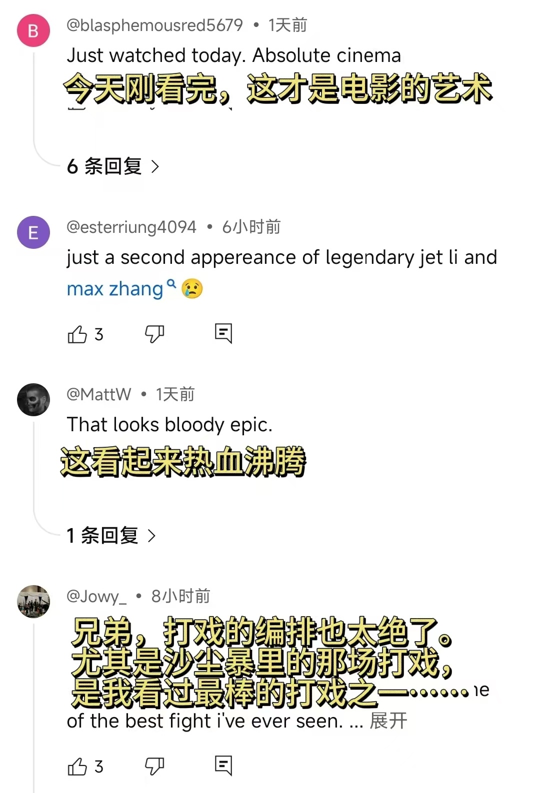 镖人海外评价镖人海外口碑 “这可能是自《卧虎藏龙》以来最好的武侠片了!”袁和平导演用顶级想象力还原江湖,海外影迷盛赞其为“武侠新巅峰”,IMAX观看体验更被赞为明智之选,谁懂这个口碑的含金量