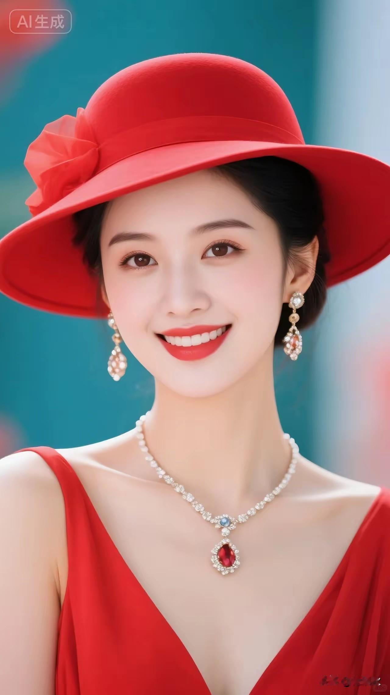 东方佳丽,红色礼帽。 艳若桃花,婀娜多姿。 冰肌玉骨,明眸皓齿。 沉鱼落雁,闭月羞花。 天生丽质,国色天香。