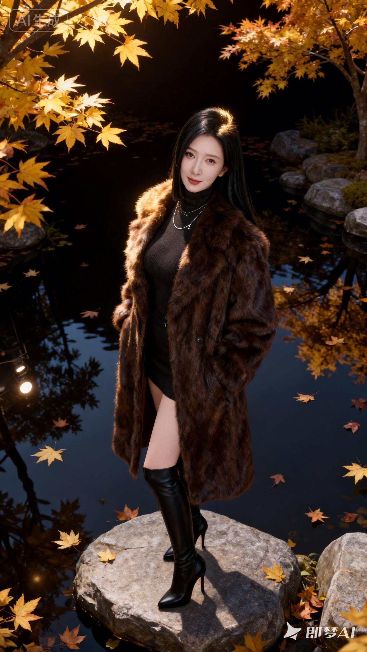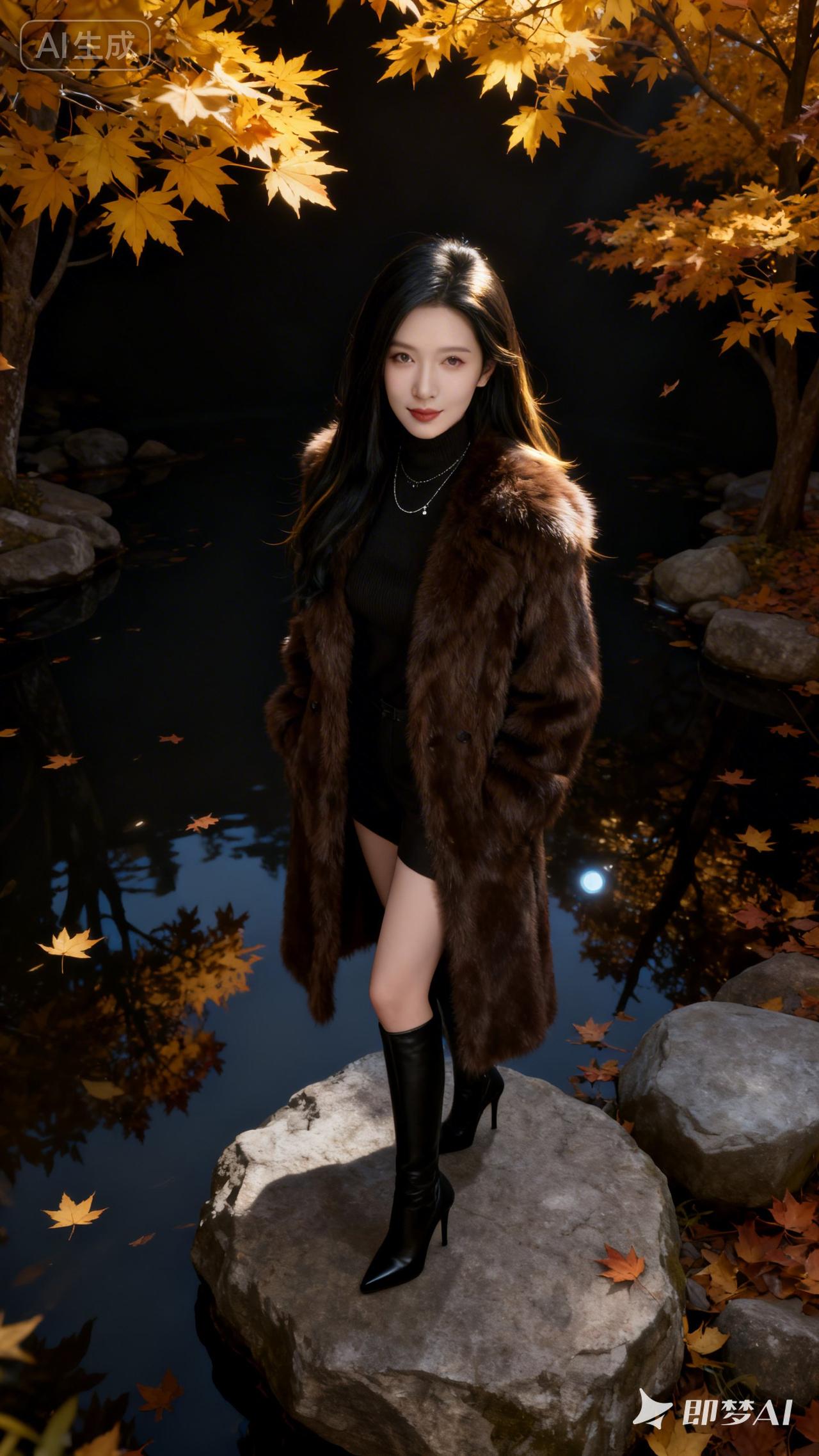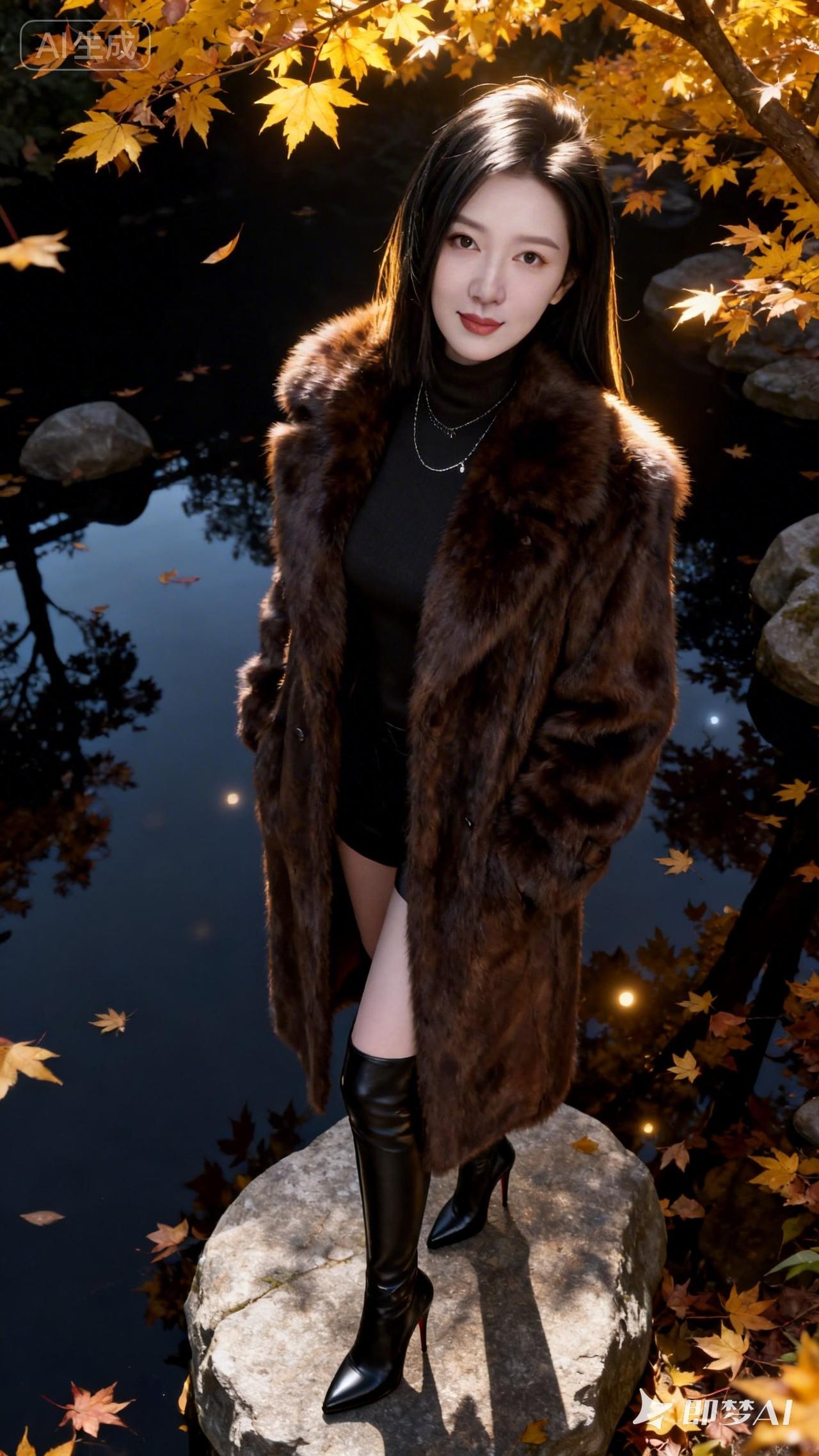 秋日暖阳下的时尚大片,黑发红唇,皮草大衣,尽显优雅与魅力。