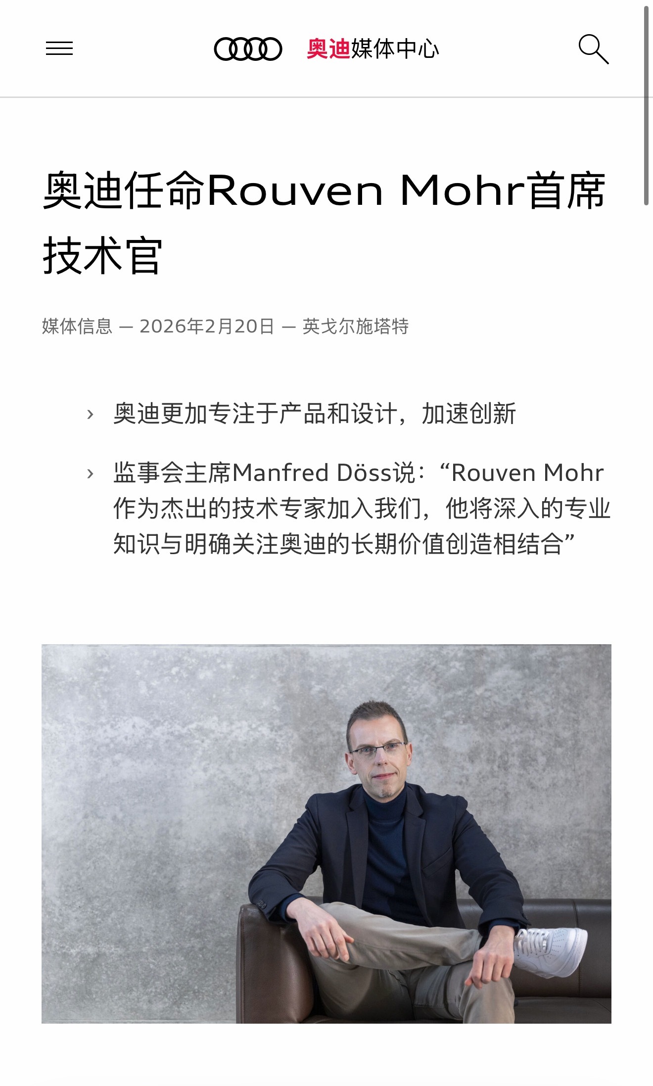 兰博基尼首席技术官Rouven Mohr,重回奥迪,任首席技术官。