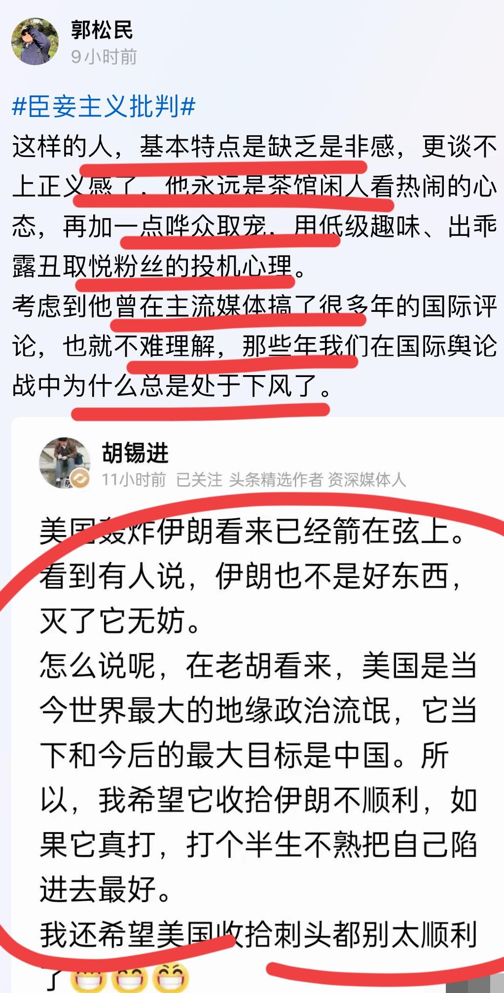 资深媒体人老胡调侃伊朗问题,被著名昆仑策高级研究员老郭怒怼!! 老胡认为,美帝打击伊朗已经无法避免! 打击一下也挺好的,因为伊朗也不是什么好东西,灭了也没啥!! 但老胡想了一下,美帝的最大对手,我们的最大敌人是谁??从战略来看,美帝收拾完伊朗,我们不就成了最大的目标了吗? 因此,他认为,美帝打伊朗是好的,希望不要这么快打下来,更希望美帝陷入进去,无法自拔。 有个刺头给美帝出难题,也挺好的!! 天呢,老胡这是啥心理啊,好歹伊朗也是我们的盟友,唇亡齿寒的道理不懂? 昆仑策高级研究员郭松民看不下去了,怒怼老胡臣妾主义,缺乏正义和是非感,这分明是茶余饭后看热闹的心态,用低级趣味迎合粉丝,投机搞流量!! 为何我们在国际舆论里总是落在下风,都是这帮人造成的!! 确实,我也没看懂胡总作为老江湖,资深媒体人,著名评论家,为何说出这样一番话,意图为何呢?