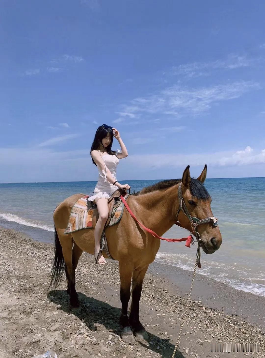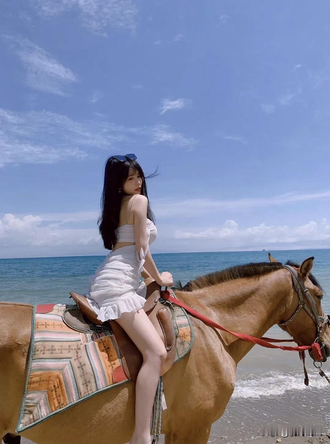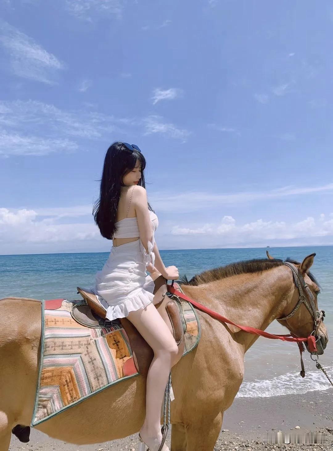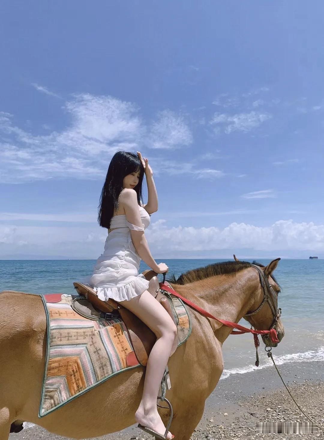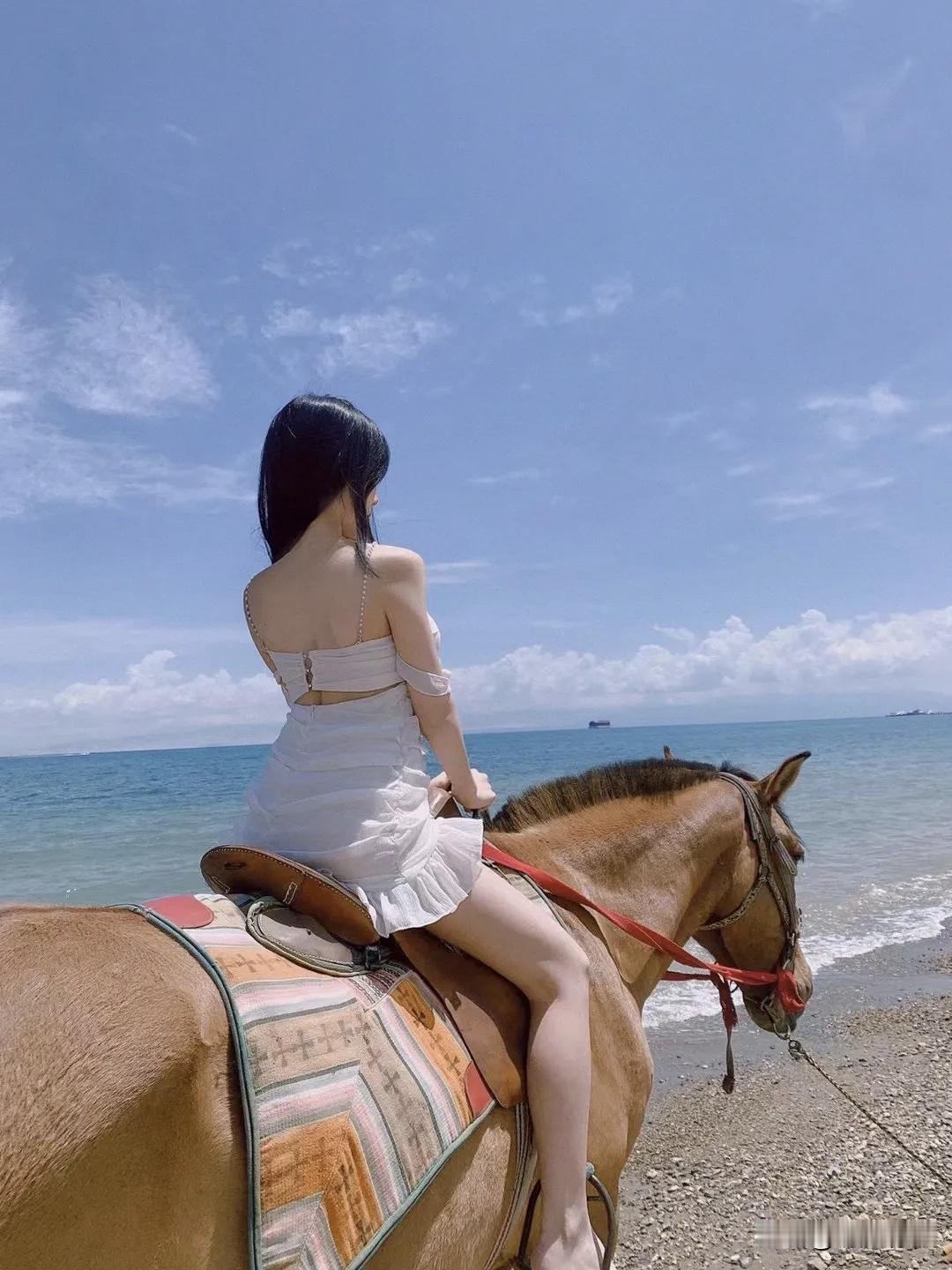 海边骑马,穿了条白色露肩裙。刚爬上马背其实有点慌,那马比我想的高太多。但等它慢慢踏进海水里,浪花扑上来打湿马蹄,整个人忽然就松弛了。 最喜欢那个回头看的瞬间。我侧坐着,腰胯还朝着海,脖子转回来对着镜头。海风正好吹过来,头发糊了几缕在脸上,也懒得拨。手握着缰绳不敢全松开,但嘴角不自觉往上翘——那种感觉怎么说呢,像背对着喜欢的人,又忍不住回头确认他还在看。 墨镜推到头顶,阳光刺眼,眯着眼笑。裙子被风吹得贴在大腿上,褶子叠了好几层。后来看照片才发现,红缰绳刚好斜着划过胸前,在白裙子上特别跳。 海边拍照这事吧,姿势不重要,重要的是你真的enjoy那一刻。我那天是真心觉得,这马也太乖了,这海也太蓝了。 新年爱好打卡海边骑马 度假海边拍照