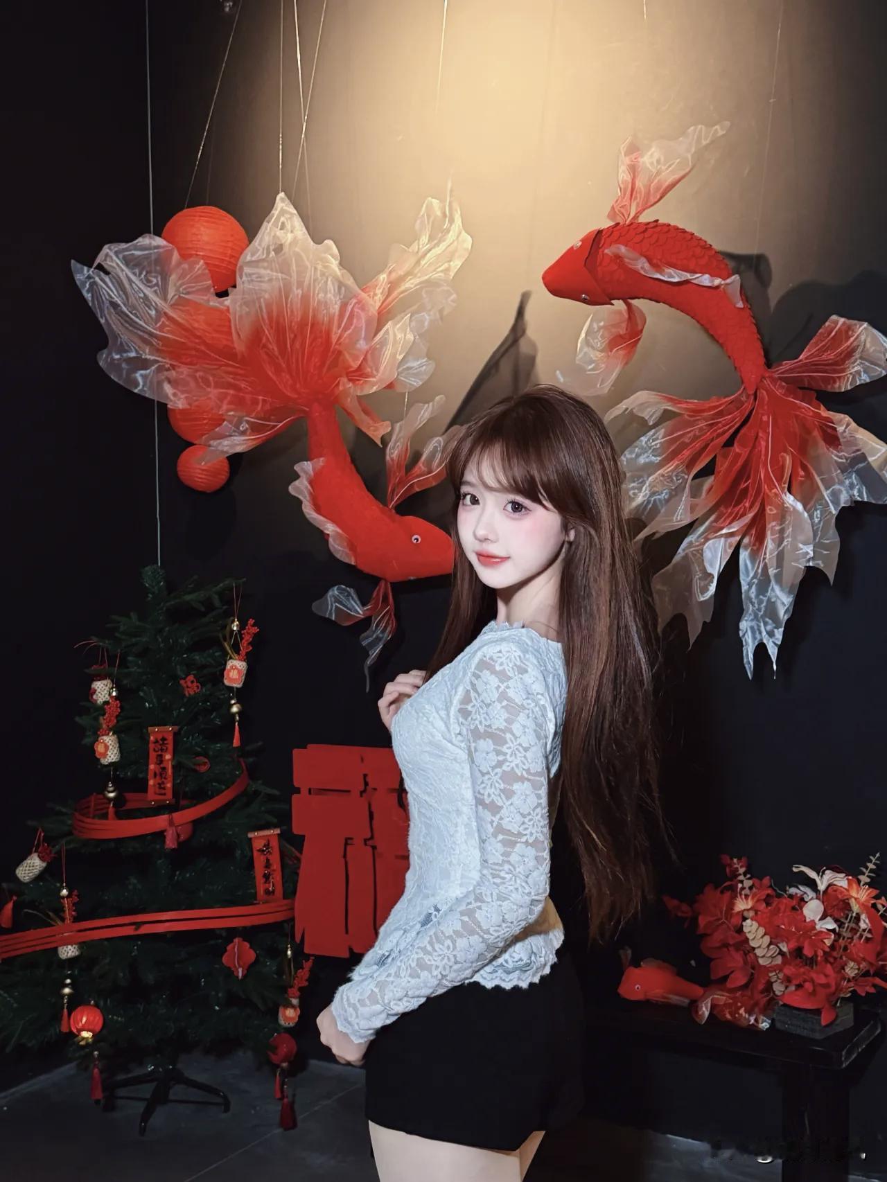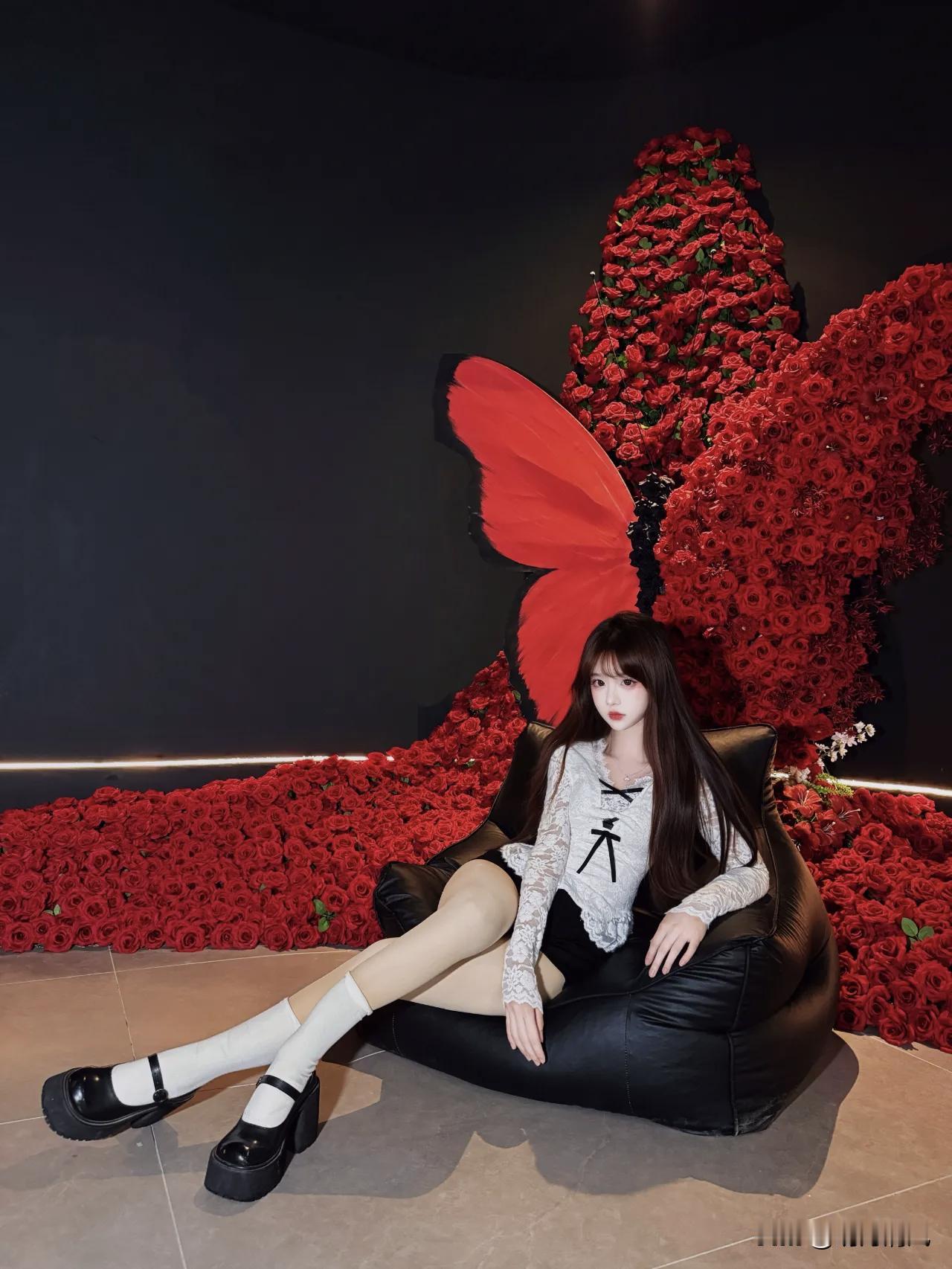 刚拍完这组棚拍花絮,真的被第三个动作戳到了。女孩陷在黑色豆袋椅里,像一朵不小心掉进墨池的云。白蕾丝上衣软软地贴着身子,黑色短裤下面,两条腿往前伸着,脚踝那儿松松垮垮的,鞋尖正好点在地上。她一只手搭着椅边,另一只手随便搁在腿上,那种不使劲儿的样子特别对。 重点是面前那片红玫瑰,堆成蝴蝶翅膀的形状,红得有点不讲道理。黑椅子、白衣服、红花海——这三个颜色撞在一起,啧,干净又带劲儿。摄影师说她当时就这么一靠,整个人陷进去,反倒把衣服的纹理和蕾丝边都衬得更清楚了。 我看的时候想,这大概就是那种“刚好”的瞬间吧。不是摆出来的,是坐进去的那一刻,人和场景自己完成了对话。 新年生活图鉴新年拍照 红黑配色